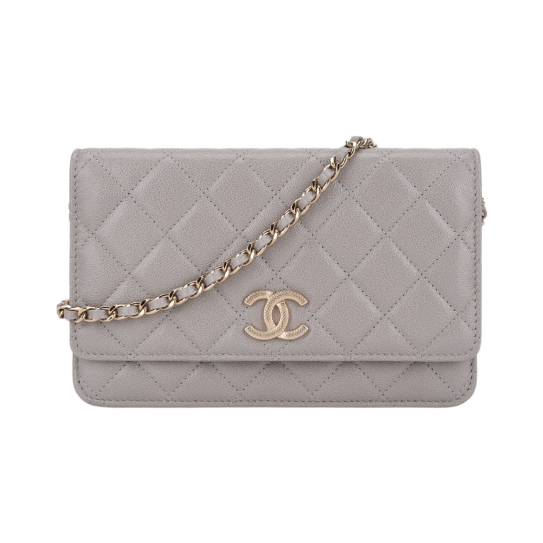 샤넬 클래식 체인 지갑 그레인드 카프스킨 & 골드 메탈 라이트 그레이