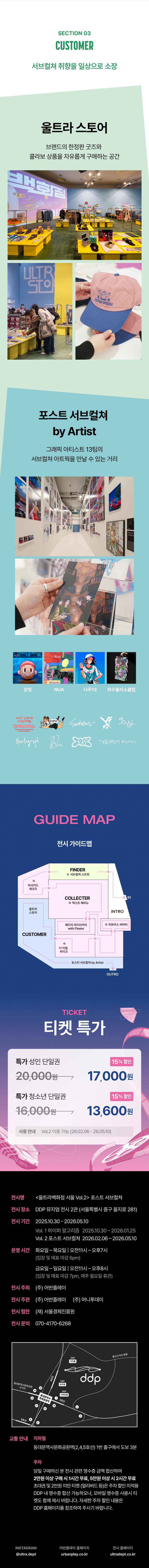 [울트라백화점 서울 Vol.2 포스트 서브컬쳐] 전체 연장 (~5/10) 관람객분들의 뜨거운 성원에 힘입어 Vol.2 전시가 5월 10일(일)까지 연장되었습니다! 더욱 풍성해진 [Vol.2 포스트 서브컬쳐 확장판]의 다양한 이벤트와 프로그램을 현장에서 직접 확인해보세요!