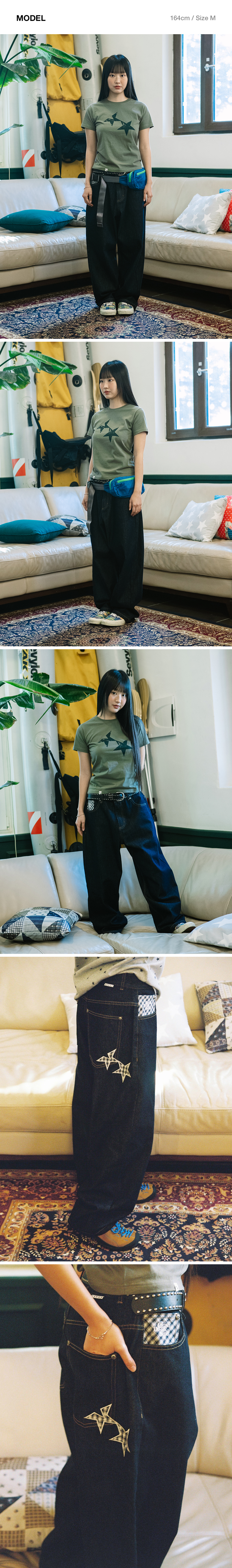 카비시 체크 아플리케 데님 팬츠 블루