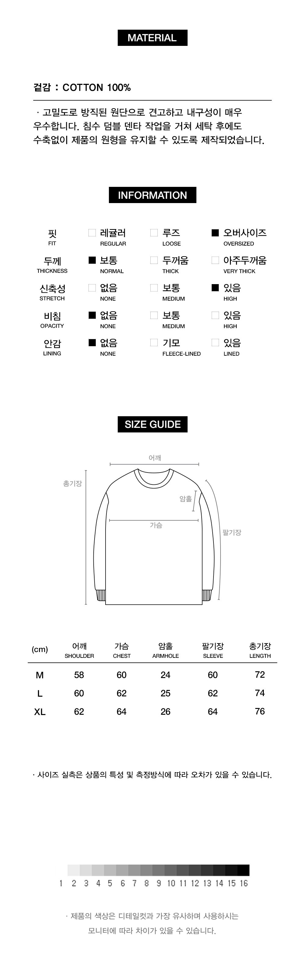 고밀도로 방직된 원단으로 견고하고 내구성이 매우 우수합니다. 침수 덤블 덴타 작업을 거쳐 세탁 후에도 수축없이 제품의 원형을 유지할 수 있도록 제작되었습니다.