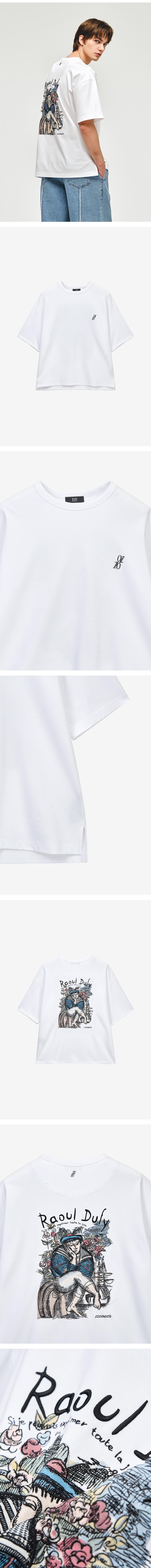 - 마드리갈 아트워크 티셔츠 - 소프트한 터치감의 100% 코튼 실켓 원단 - 앞면 로고 자수 - 뒷면 스테판 말라르메(Stéphane Mallarmé)의 시집 『Madrigaux』(마드리갈)에 수록된 라울뒤피의 삽화 아트워크 디지털 프린팅에 자수