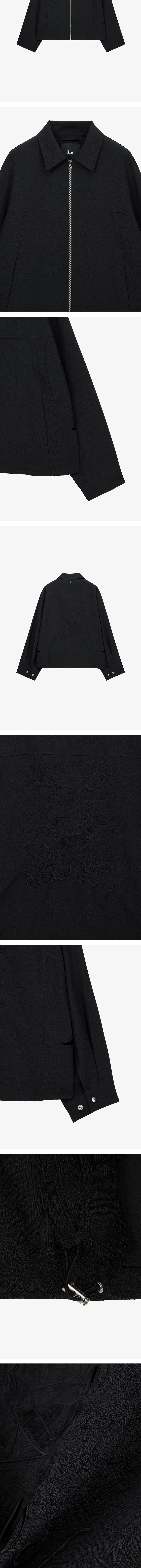 - 마드리갈 엠브로이드 점퍼 블랙 - 린넨라이크 폴리 소재 - 숏 기장의 여유있는 실루엣 - 라울 뒤피 마드리갈 아트워크 자수 디자인 - 몸판 사이드 슬릿 디자인 - 뒷넥 하단 금속 로고 리벳 부착 - 밑단 안 스트링, 스토퍼 적용하여 사이즈 조절 가능