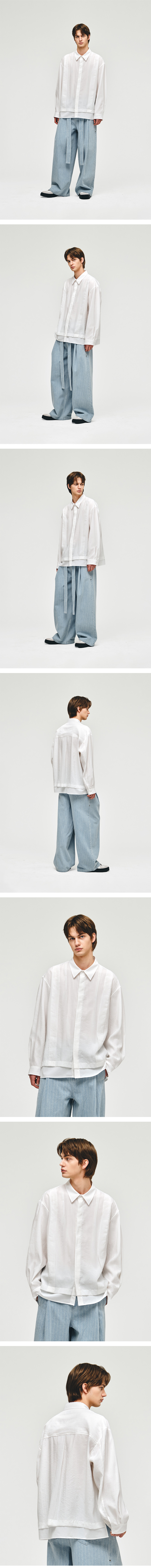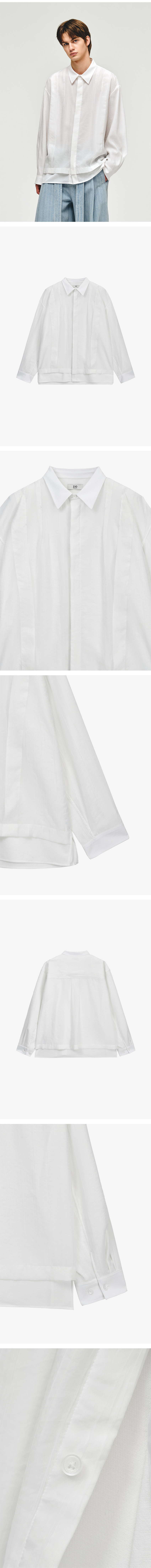 - 레이어드 크롭 셔츠 화이트 - 트윌 조직의 가벼운 폴리 소재와 플리츠 오간자 소재를 사용 - 두가지 소재를 레이어드한 디자인과 턱 디테일 포인트 - 여유있는 오버핏 사이즈로 활동성이 편리함