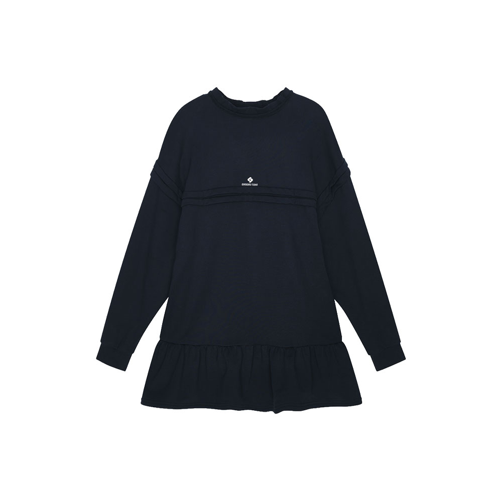 슈슈통 우먼 로우 엣지 웨이브 칼라 턱 디테일 스웨트셔츠 드레스 네이비 블루 입니다. - 로우 엣지로 마감된 유니크한 네크라인 - 정교한 턱 디테일 - 편안한 코튼 스웨트셔츠 소재에 드레시한 밑단 프릴을 더해 일상에서도 특별한 무드를 연출 가능