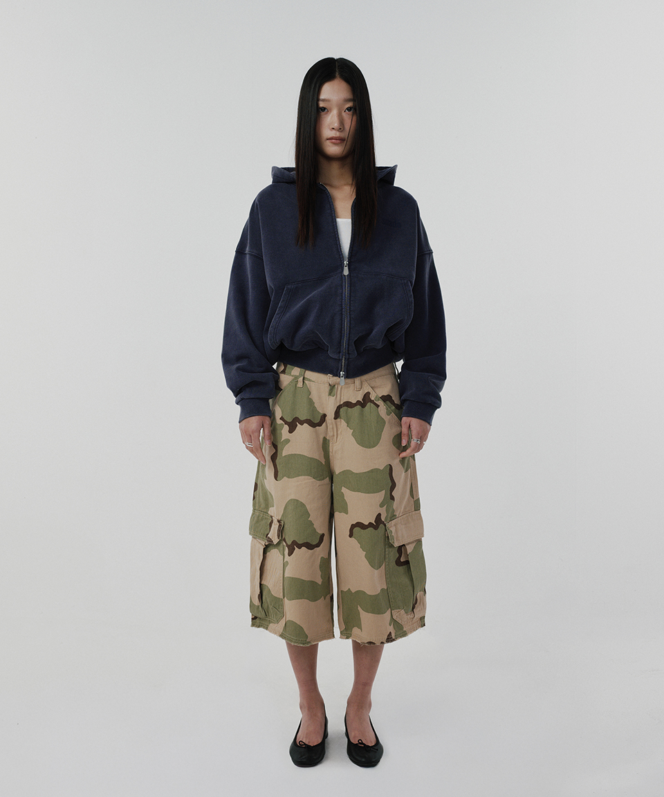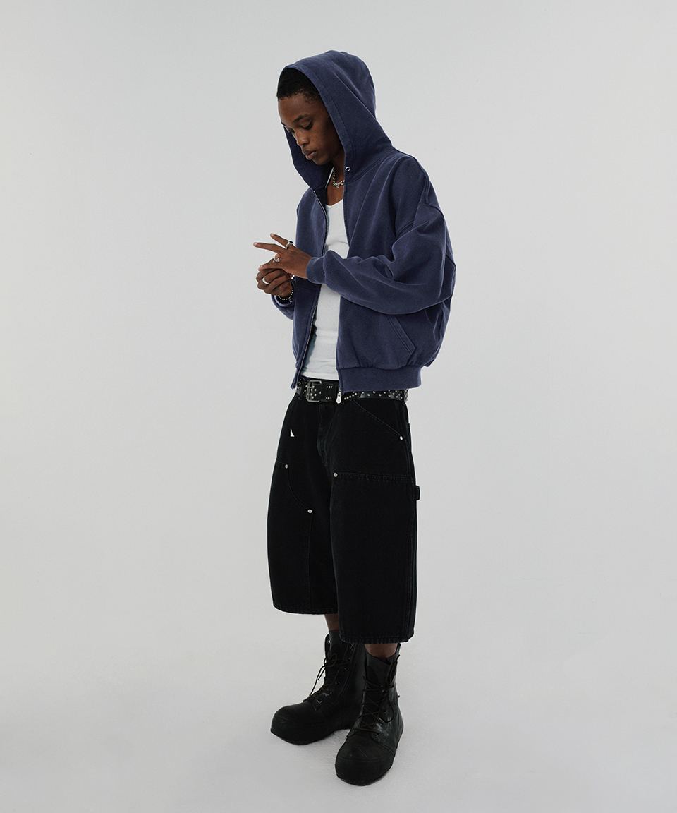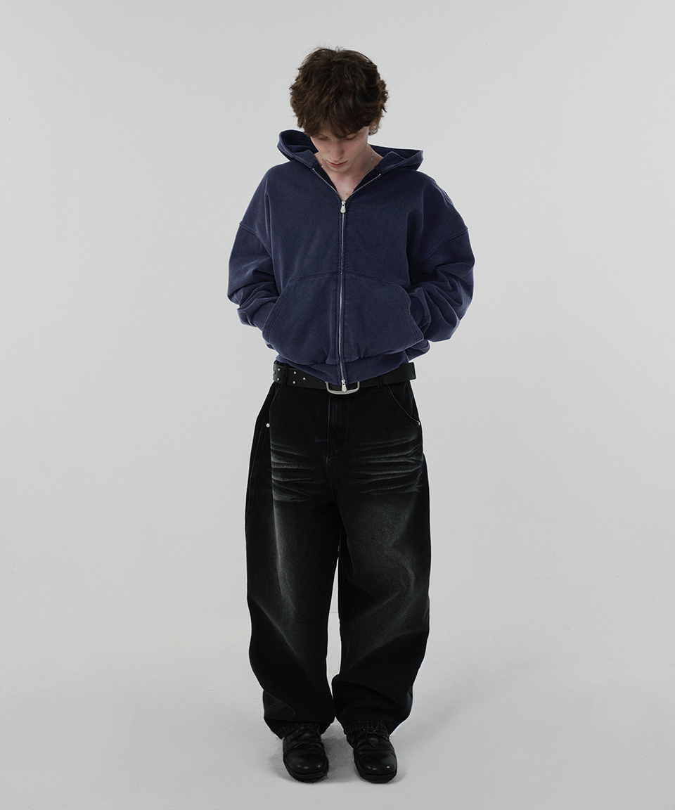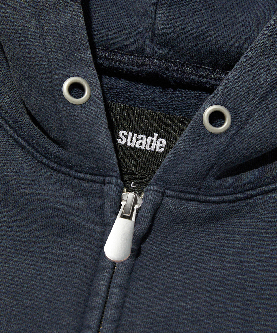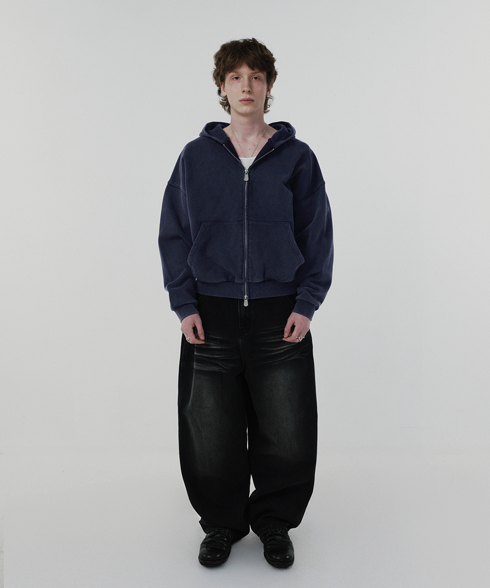 스웨이드 크롭 워시드 후드 집업 워싱 네이비
