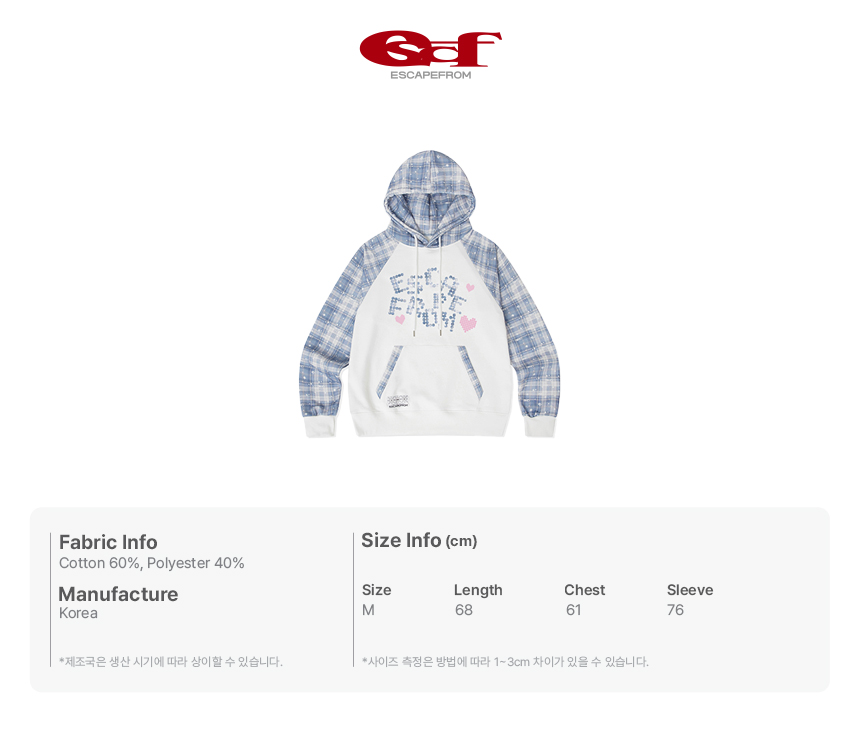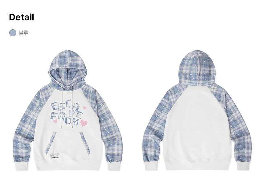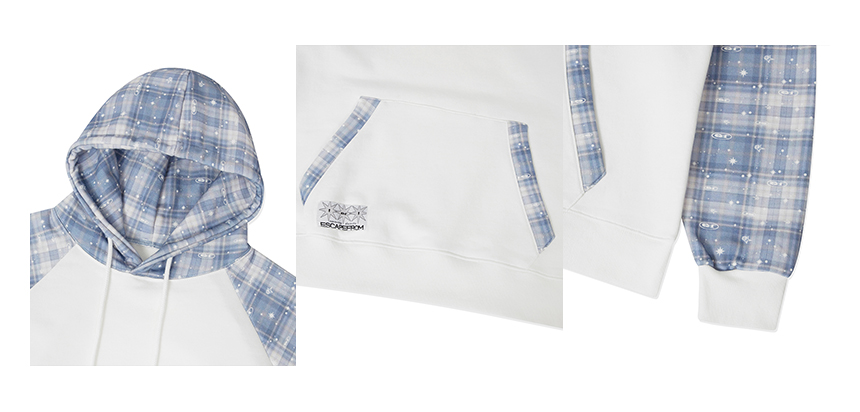 이스케이프프롬 하트 로고 닷 앤드 로고플레이 체크 래글런 후드티 블루