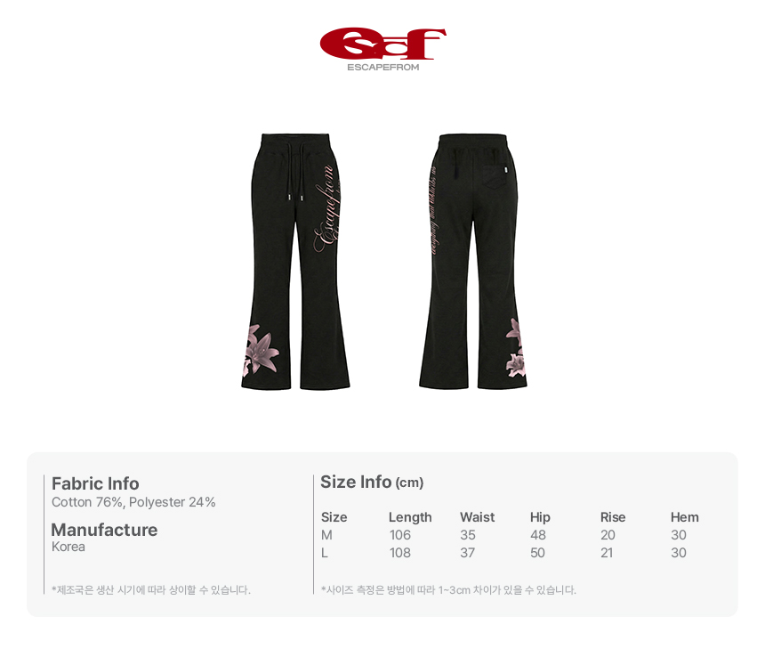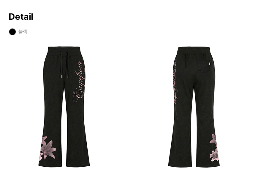 이스케이프프롬 플라워 레터링 프린트 부츠컷 스웻팬츠 블랙