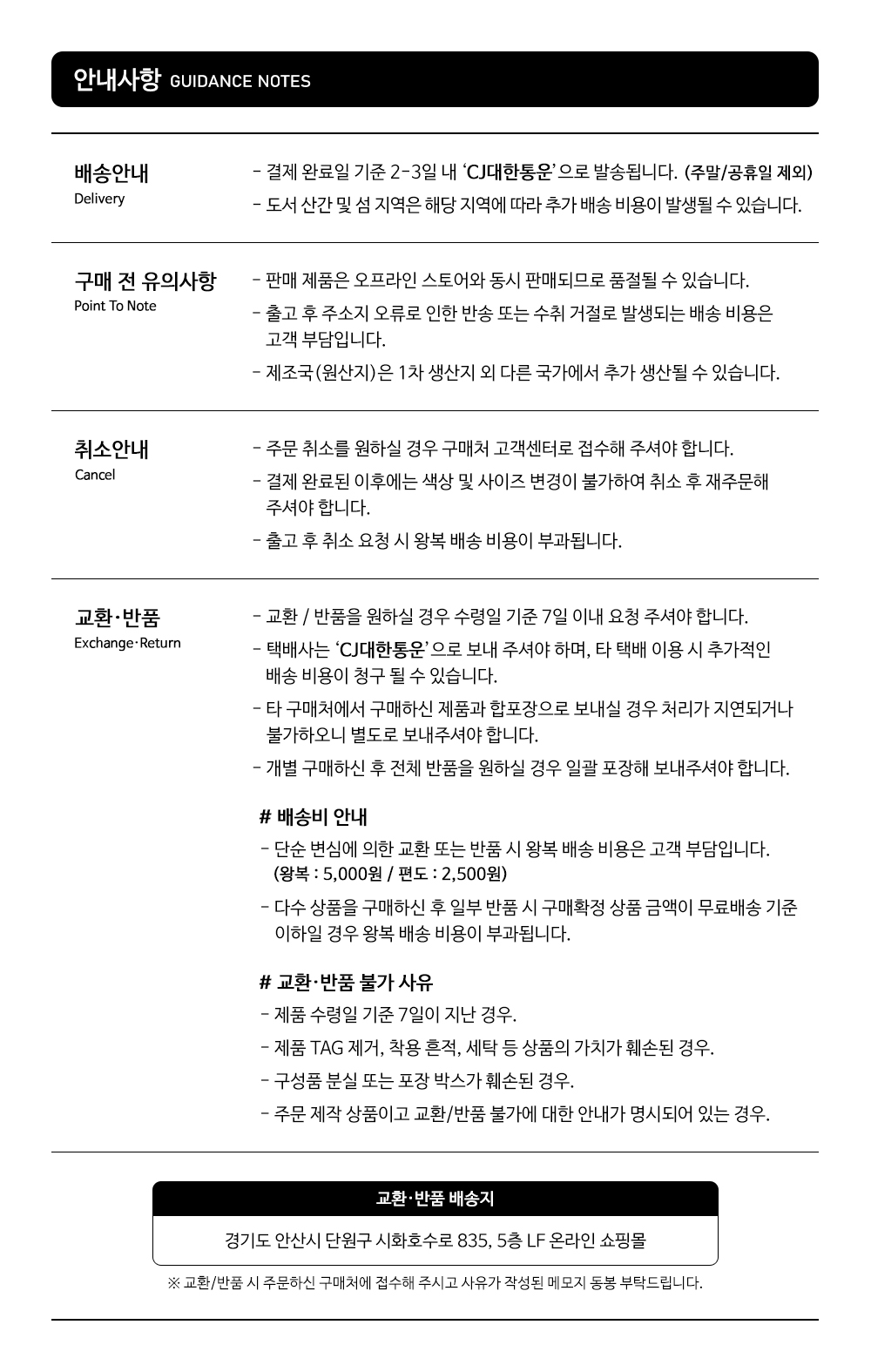 교환 및 반품 안내