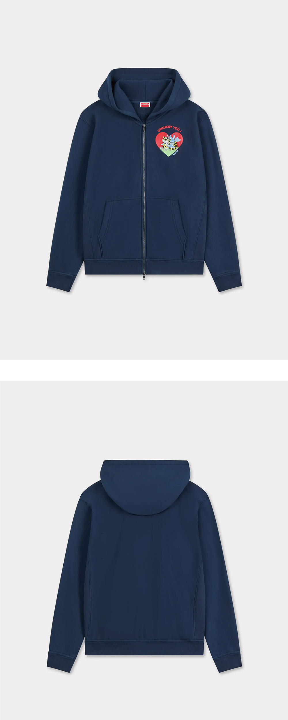 겐조 카툰 집업 후디 네이비 블루 입니다. - 가볍고 부드러운 기모 처리되지 않은 몰레톤 소재 - 굵은 골지 디테일 - 가슴 부분에 프린트된 그래픽 - 앞면 포켓 두 개 - 양방향 지퍼