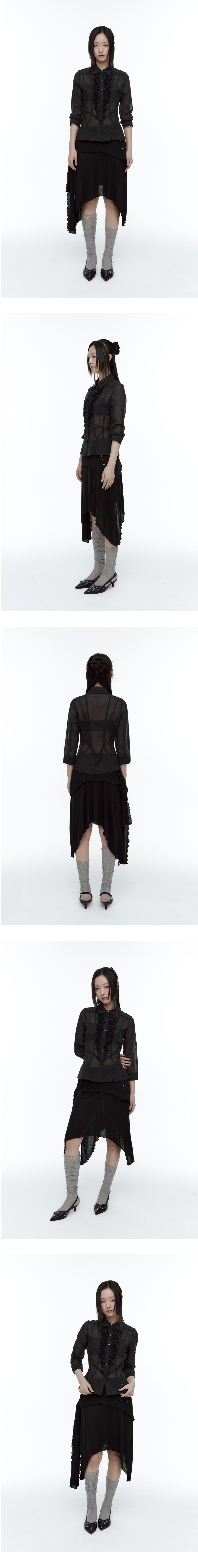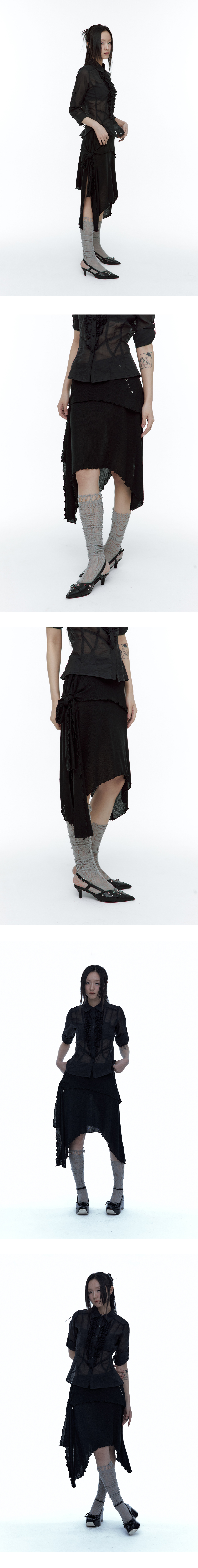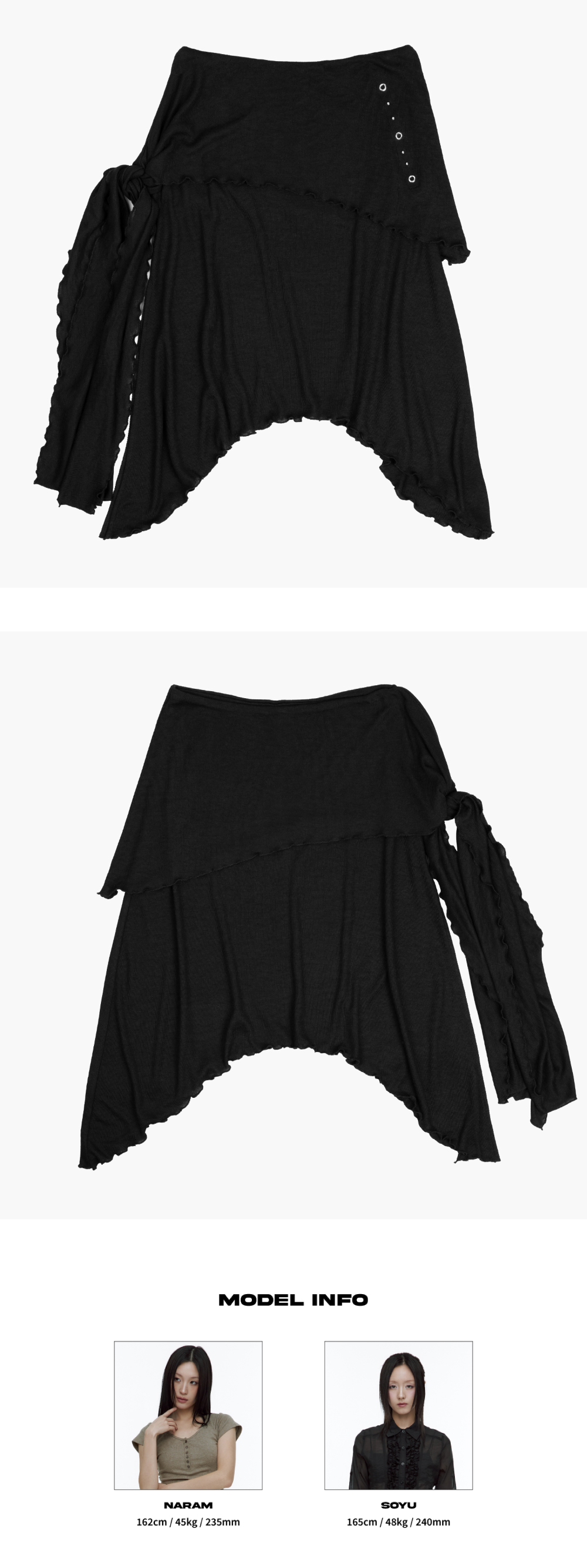 부드러운 니트 소재를 사용하여 착용감이 편안하며, 몸에 맞춰 자연스럽게 흐르는 핏을 연출합니다. 비대칭으로 떨어지는 언밸런스한 밑단 라인과 레이어드된 듯한 상단의 이중 디자인, 내추럴한 마감 처리로 디테일을 살렸습니다. 전면 상단에는 실버 아일렛 장식으로 포인트를 주었으며, 옆면의 긴 리본 스트랩을 묶어 연출이 가능합니다. 특히 소재 특유의 아주 살짝 비치는 느낌이 실루엣 라인을 더욱 자연스럽게 만들어 줍니다. - 비침정도 : ■ ■ □ □ □ - 스판정도 : ■ ■ ■ ■ ■ - Polyester 100% - Model Info : NARAM (162cm / 45kg), SOYU (165cm / 48kg) - Fitting size : FREE