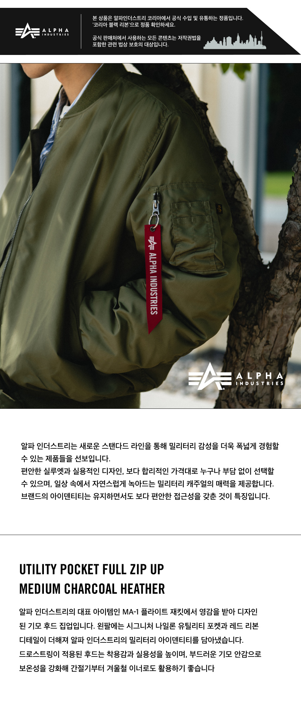 알파 인더스트리 유틸리티 포켓 풀 집 업 미디엄 차콜 헤더