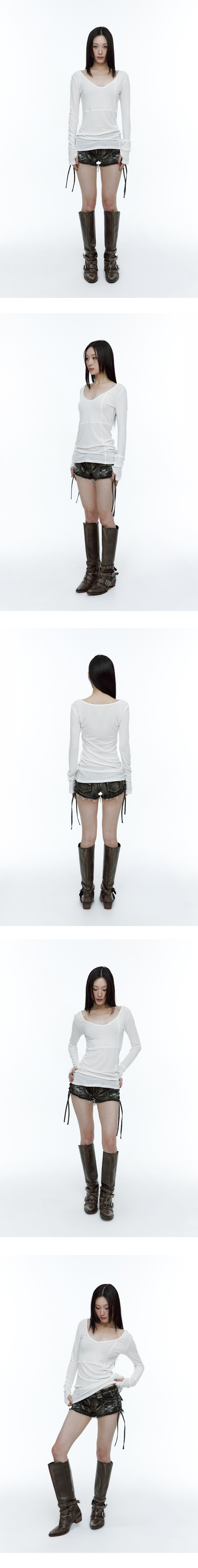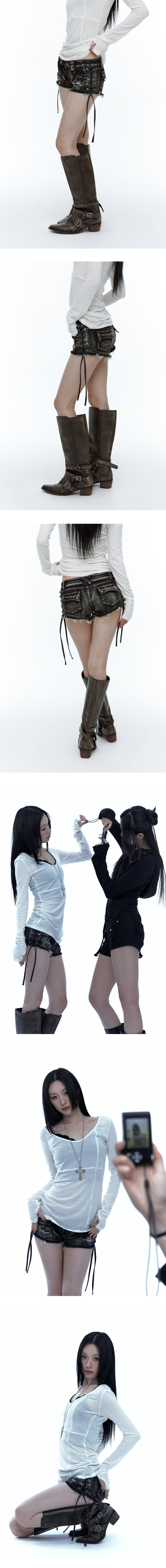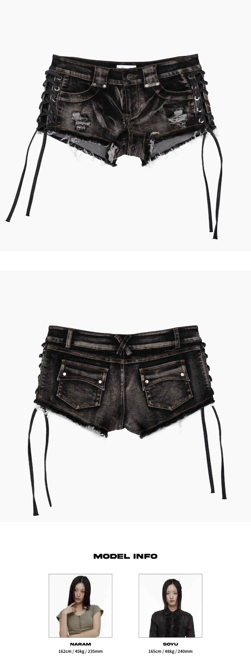 빈티지한 블랙 워싱 가공을 거친 데님 소재를 사용하였으며, 높은 스판 함유량으로 편안한 착용감을 제공합니다. 로우라이즈 실루엣에 양 사이드 아일렛 레이스업 장식을 더해 포인트를 주었으며, 전면의 데미지 가공과 밑단의 컷오프 마감으로 디테일을 살렸습니다. 벨트 루프와 포켓 부분에는 실버 스터드 장식을 배치하여 마감하였습니다. - 비침정도 : □ □ □ □ □ - 스판정도 : ■ ■ ■ ■ □ - Cotton 78% Polyester 20% Span 2% - Model Info : NARAM (162cm / 45kg), SOYU (165cm / 48kg) - Fitting size : S