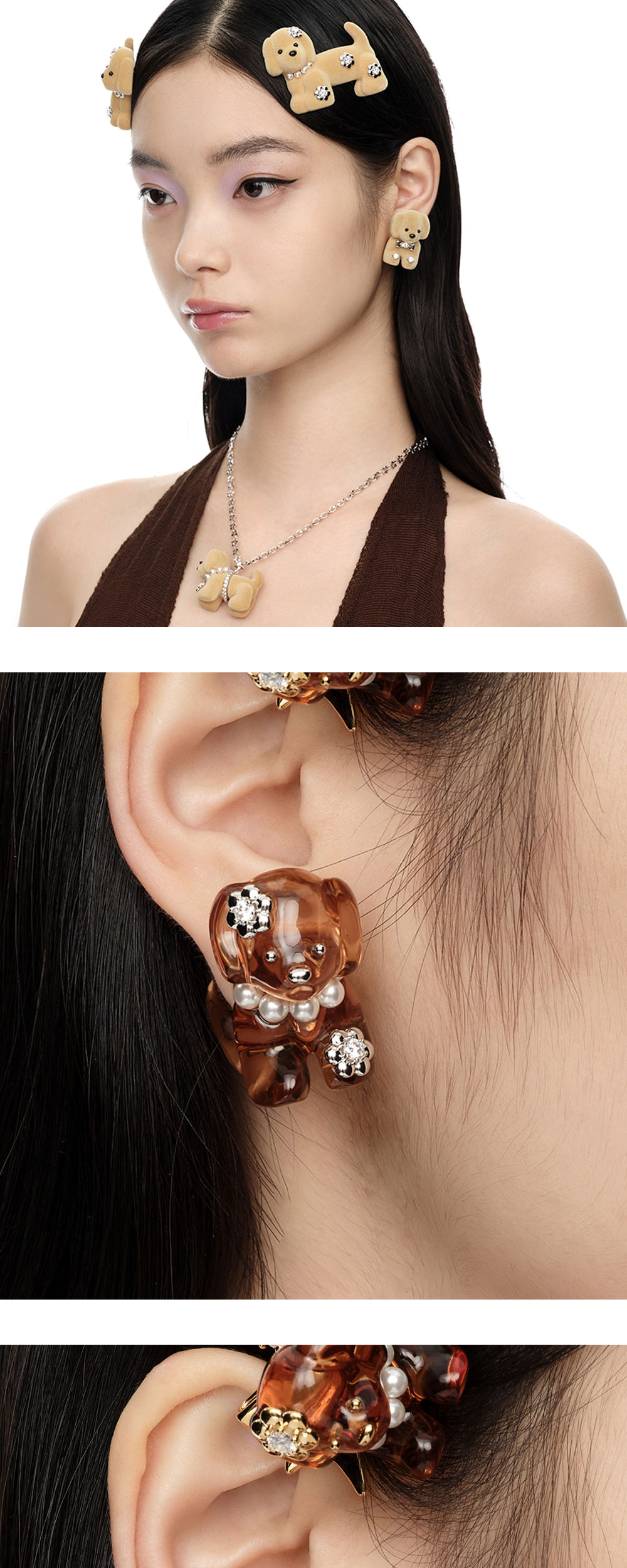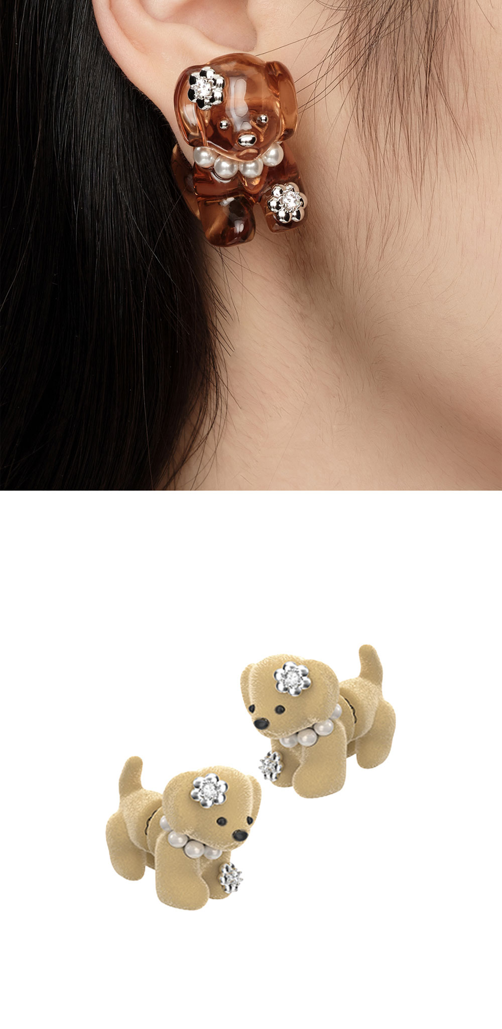 위민 스플릿 퍼피 이어링 라이트 브라운입니다. - 강아지 펜던트가 앞뒤로 분리되어 귀를 통과하는 듯한 '스플릿' 디자인 - 라이트 브라운 컬러의 플록 소재 강아지 펜던트가 특징 - 펜던트 전면에 세팅된 지르콘 링 포인트로 고급스러운 디테일 완성 - 한쪽당 약 1.5g 내외의 가벼운 무게감으로 편안한 착용감 제공 * 모델 컷은 참고를 위한 이미지이며 같은 제품의 다른 컬러 사진이 포함되어있습니다.