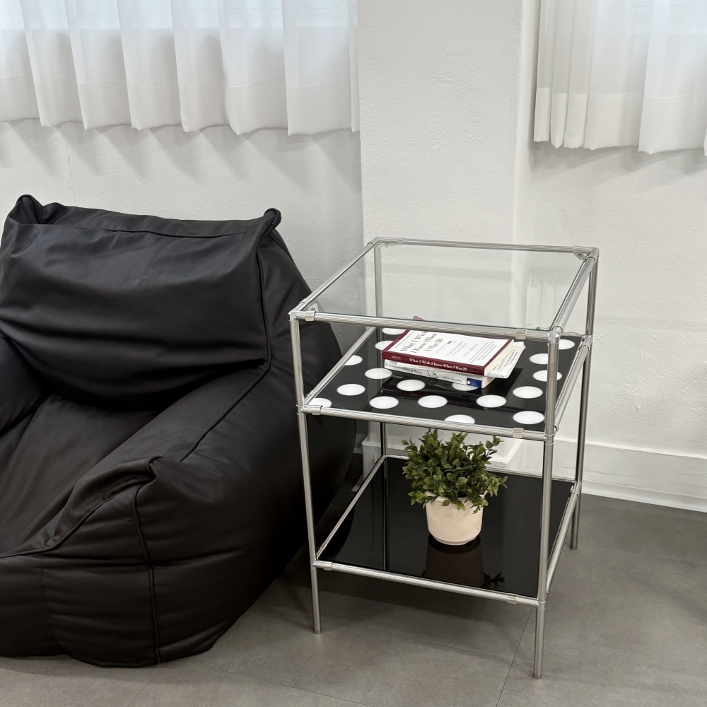 Glass module Shelf 기존 모듈 가구와 달리 디자인 아크릴을 매치해 공간에 감각적인 포인트를 더해주는 제품입니다. 완조립 상태로 배송되며, 유리와 아크릴 선반을 원하는 위치에 자유롭게 조합하여 사용할 수 있어 공간과 용도에 맞는 연출이 가능합니다. 제품 안내 모듈 가구 특성상 약간의 흔들림이 있을 수 있습니다 스테인리스 앵글과 아크릴/유리 사이에 미세한 틈이 존재합니다 하단은 백색 고무 마개로 마감되어 미끄럼을 방지합니다 완조립 상태로 발송되어 별도의 조립 없이 바로 사용 가능합니다 주문 제작 상품으로 3일~14일 이내 발송됩니다. ※ 위 안내된 제품 특성으로 인한 사유는 교환 및 환불이 불가하오니 구매 전 반드시 참고 부탁드립니다. 소재 15T 스테인리스 / 5t 유리 / 5t 아크릴