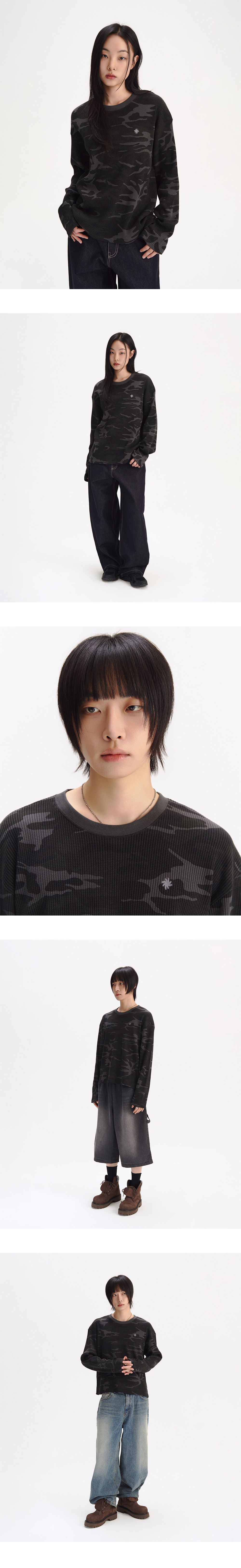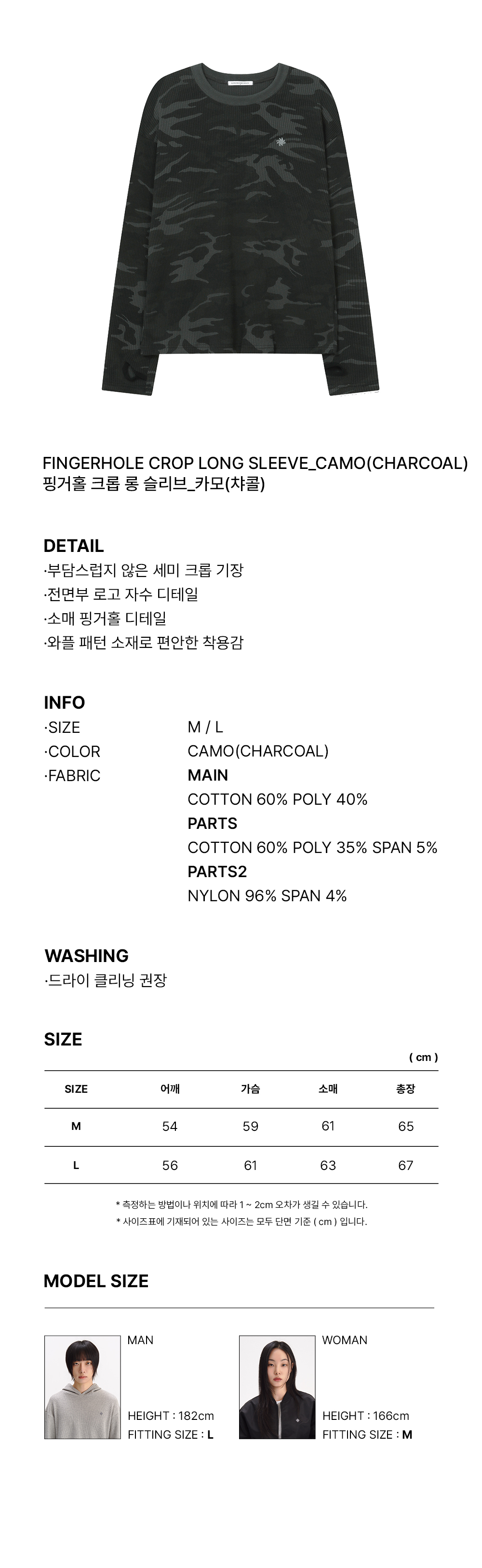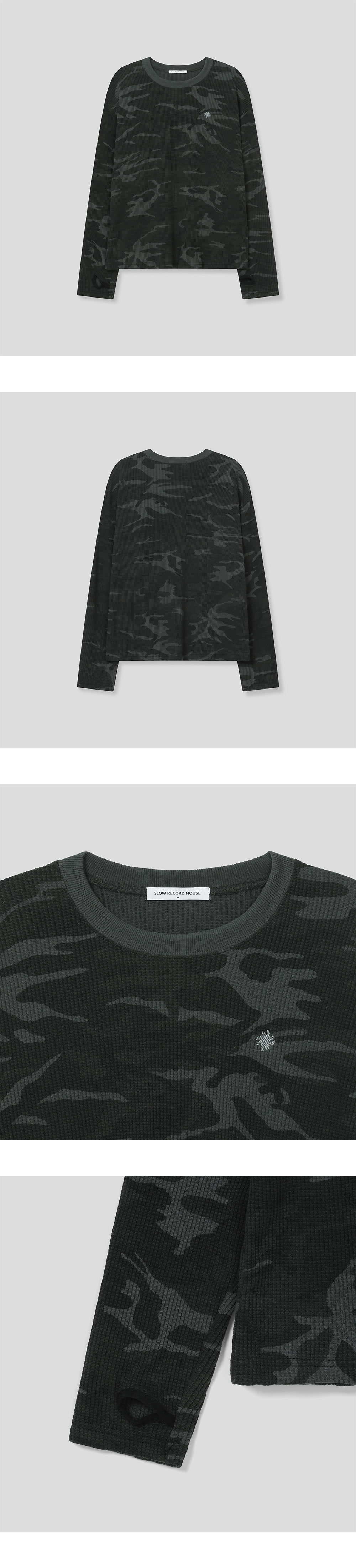 슬로우 레코드 하우스 핑거홀 크롭 롱 슬리브 카모 챠콜