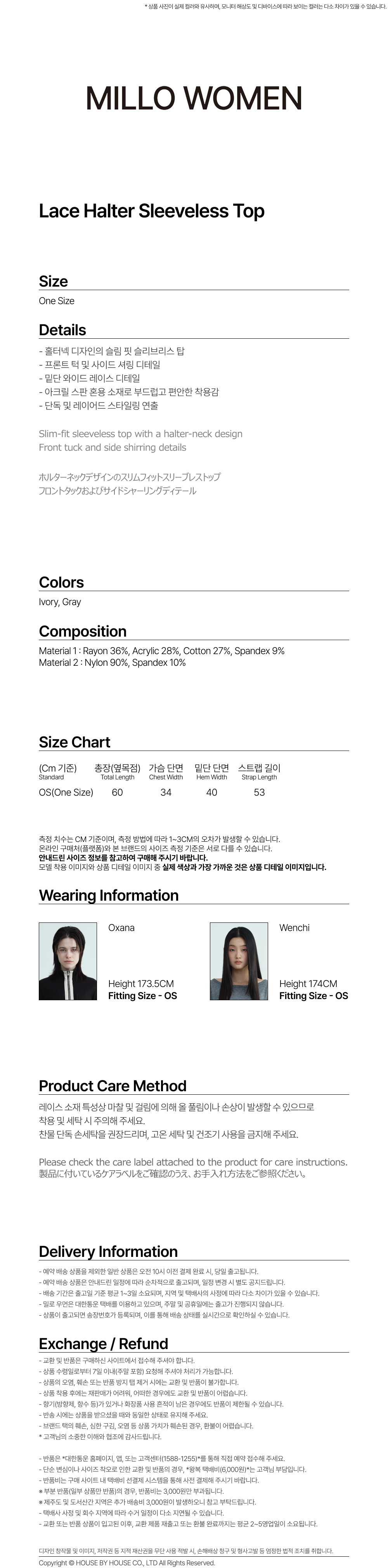 밀로 우먼 레이스 홀터 슬리브리스 탑 그레이