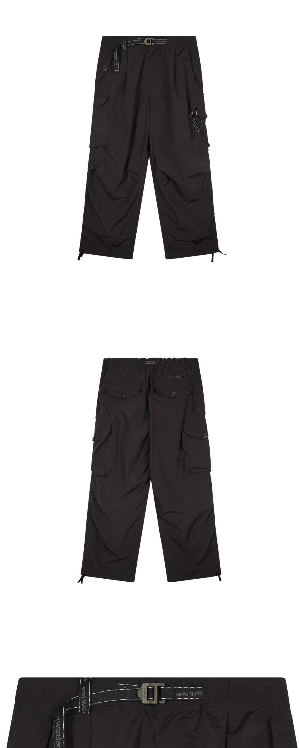 앤드 원더 091 오버사이즈 카고 팬츠 블랙 입니다. - 발수 립스탑 소재로 뛰어난 내구성 - 여유롭고 넓은 실루엣의 와이드 핏 - 브랜드 로고가 새겨진 일체형 벨트와 시그니처 카라비너 포함