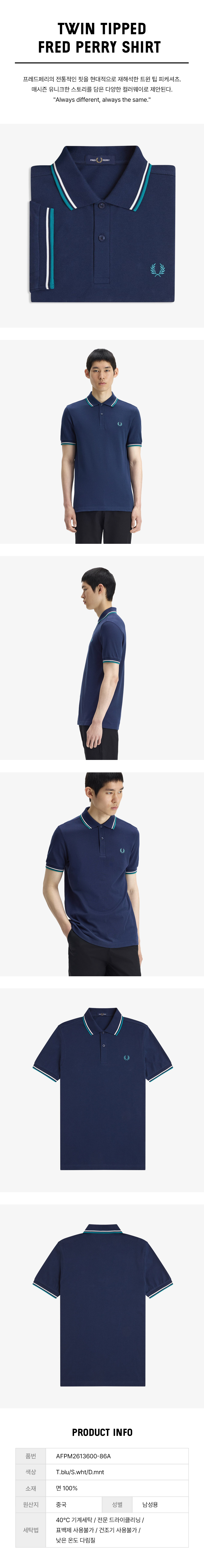 프레드페리 M3600 트윈 팁 프레드페리 셔츠 테니스블루 스노우화이트 딥민트