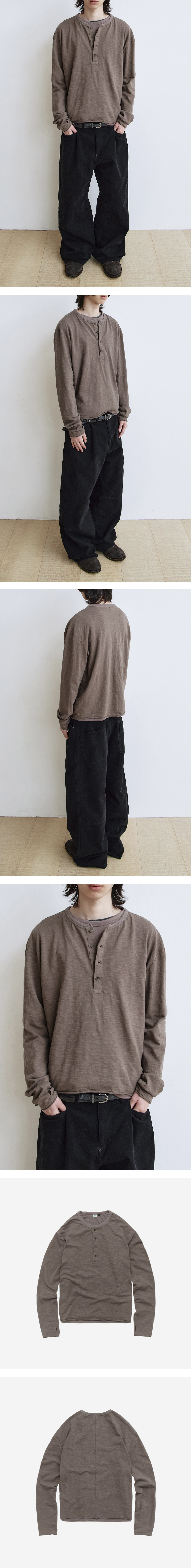 henley neck long sleeves - 레이어드 형태의 헨리넥 롱 슬리브 - 가먼트 워싱 - 빈티지한 질감의 슬럽 원단 + 실키한 촉감의 라운드 넥 이너 - 러프한 밑단 마감 - 단품 및 레이어드 활용 모두 용이한 기장 밸런스 - 일체형 디자인 *모델: 178cm, 마른 체형 / 3사이즈 착용