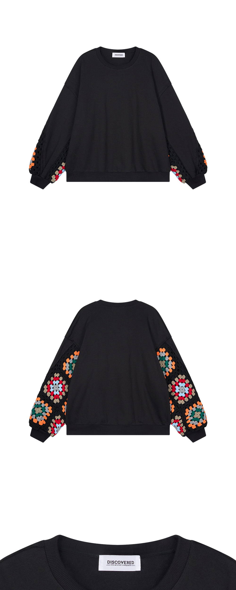 디스커버드 크로셰 슬리브 스웨트 블랙 입니다. - 소재의 적당한 두께감과 쾌적한 착용감 - 소매 전체에 적용된 화려한 핸드메이드 크로셰 포인트 - 자연스럽게 떨어지는 여유로운 실루엣 - 탄탄한 시보리 마감과 입체적인 소매 라인