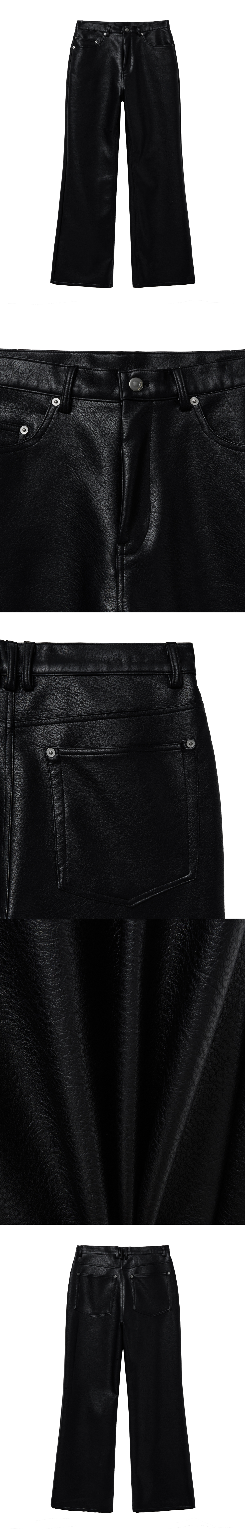 페이크 레더 원단으로 제작된 세미 와이드 부츠컷 팬츠입니다. 스탠다드한 부츠컷보다 여유 있는 실루엣으로 떨어지며, 유연한 텍스처와 은은한 광택이 실루엣에 힘을 더합니다. 블랙 컬러 특유의 대비감이 스타일에 강한 인상을 부여합니다. -DETAIL- 세미 와이드 부츠컷 실루엣 5포켓 디자인 리벳 디테일 MADE IN KOREA
