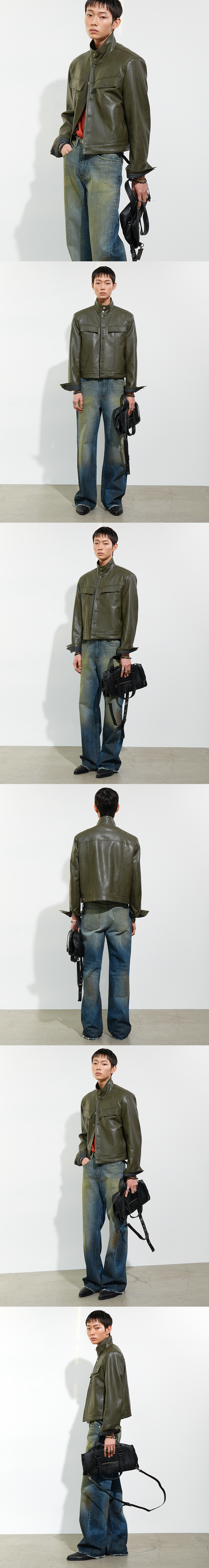 페이크 레더 소재로 제작된 하이넥 트러커 재킷입니다. 하이넥 구조와 어깨 패드가 결합되어 상체 라인을 또렷하게 잡아주며, 컴팩트한 기장감으로 균형 잡힌 실루엣을 완성합니다. 뒷면 하단에는 사이즈 조절이 가능한 탭 디테일을 더해 착용자의 체형에 맞게 실루엣 조절이 가능합니다. -DETAIL- 하이넥 구조 어깨 패드 내장 프런트 버튼 여밈 가슴 플랩 포켓 뒷면 사이즈 조절 탭 디테일
