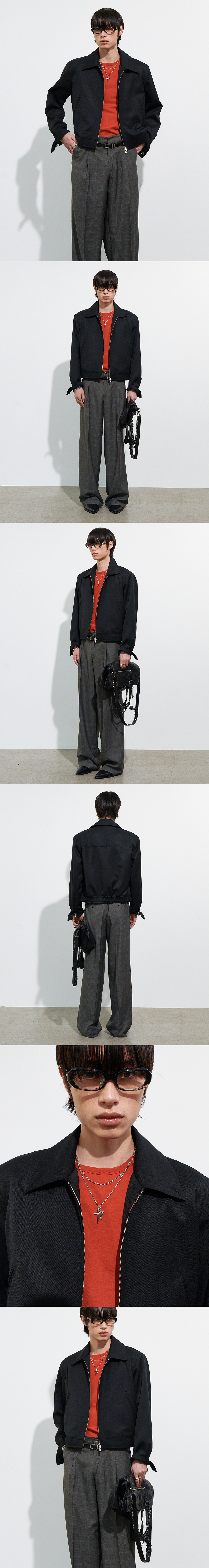 울 소재로 제작된 숏 기장의 구조적인 자켓입니다. 뒷면 밑단에 밴딩을 적용해 블루종과 자켓 특유의 구조와 여유를 갖춘 실루엣을 완성하였습니다. 어깨 패드를 더해 상체 라인을 입체적으로 정리하며, 짧은 기장과 균형을 이루는 볼륨감을 형성합니다. -DETAIL- 칼라 버튼 여밈 구조로 하이넥 연출 가능 어깨 패드 내장 프런트 지퍼 여밈 뒷면 밴딩 처리 사이드 웰트 포켓 지퍼와 단추 여밈이 결합된 커프스 형태 소매 MADE IN KOREA