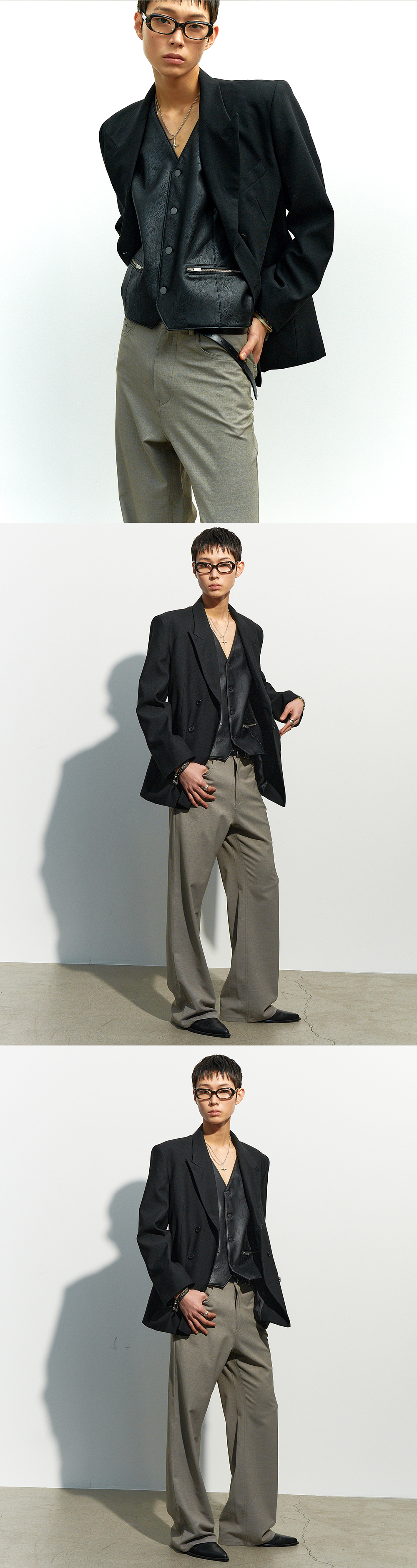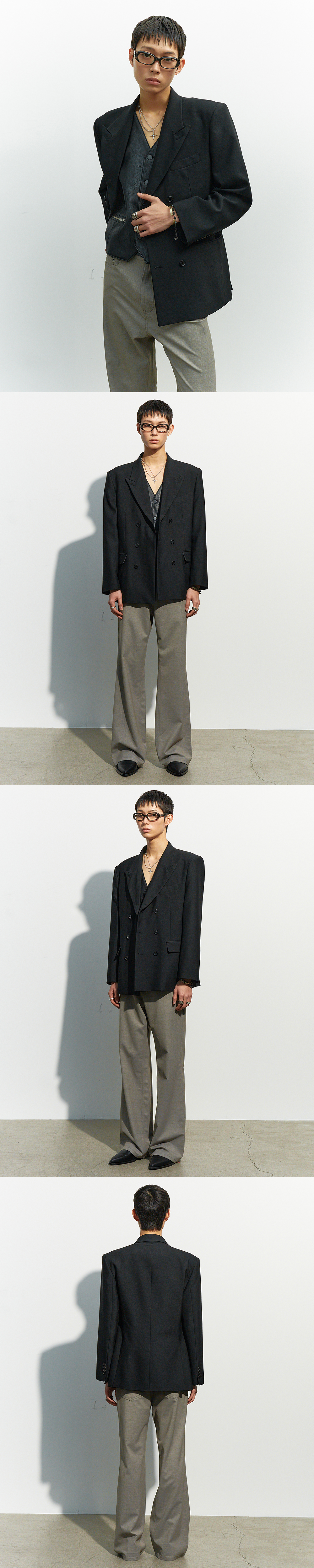 울 소재를 사용해 제작한 더블 브레스티드 자켓입니다. 피크드 라펠과 구조적인 패턴 설계가 어우러져 정제된 실루엣을 완성하며, 클래식한 요소를 기반으로 균형 잡힌 인상을 담아냈습니다. 숄더 패드가 내장되어 안정감 있는 어깨선을 연출하며, 포멀한 무드에 집중한 완성도 높은 아이템입니다. -DETAIL- 울 소재 원단 더블 브레스티드 여밈 피크드 라펠 숄더 패드 내장 플랩 포켓 & 가슴 웰트 포켓 리얼 버튼 커프스 MADE IN KOREA