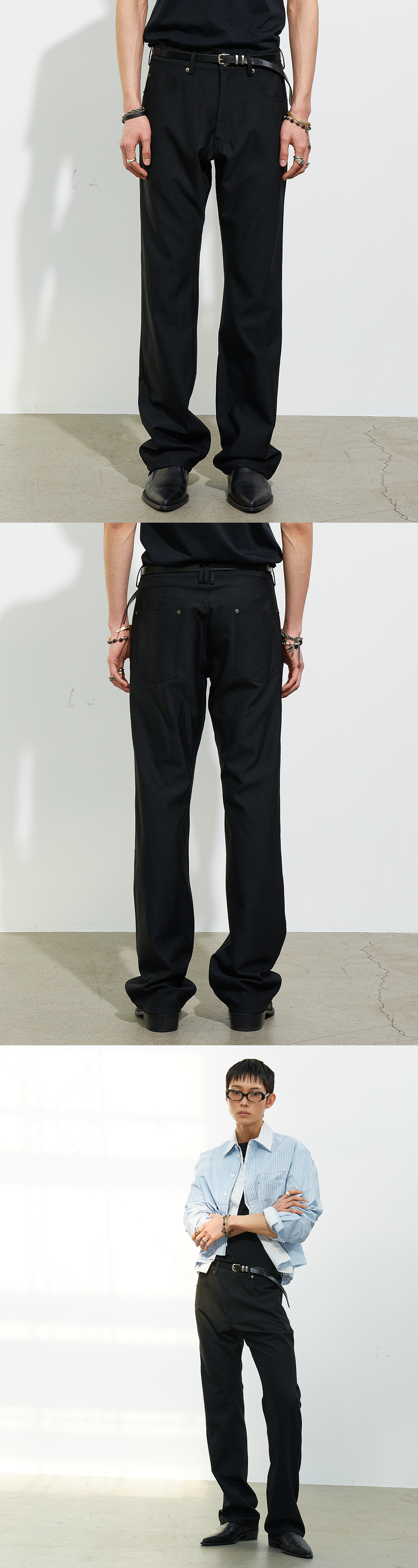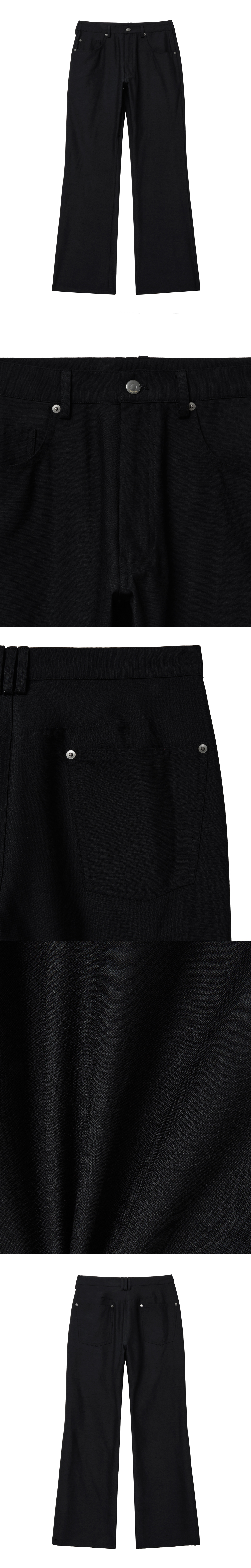 울 소재로 제작된 부츠컷 팬츠입니다. 슬림하게 떨어지는 실루엣에 부츠컷 라인을 결합해 다리 라인을 따라 자연스럽게 퍼지는 실루엣이 세련된 무드를 연출합니다. 울 트윌 특유의 탄탄한 조직감과 정제된 결감이 어우러져 차분하면서도 단정한 인상을 완성합니다. -DETAIL- 부츠컷 실루엣 5포켓 디자인 리벳 디테일 MADE IN KOREA