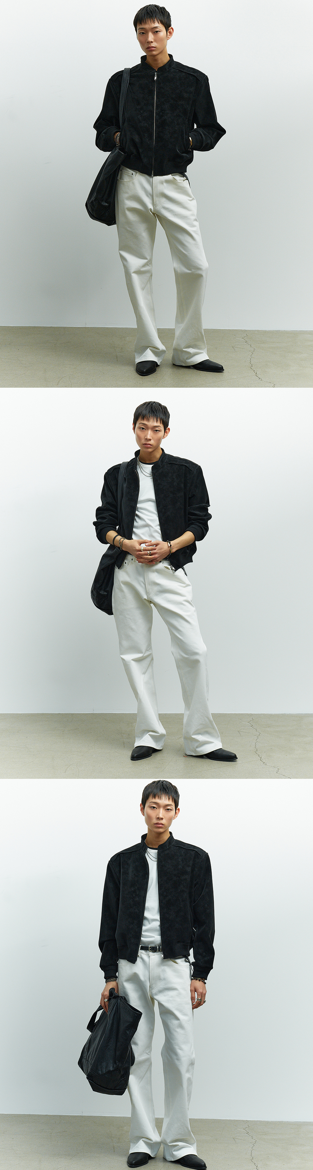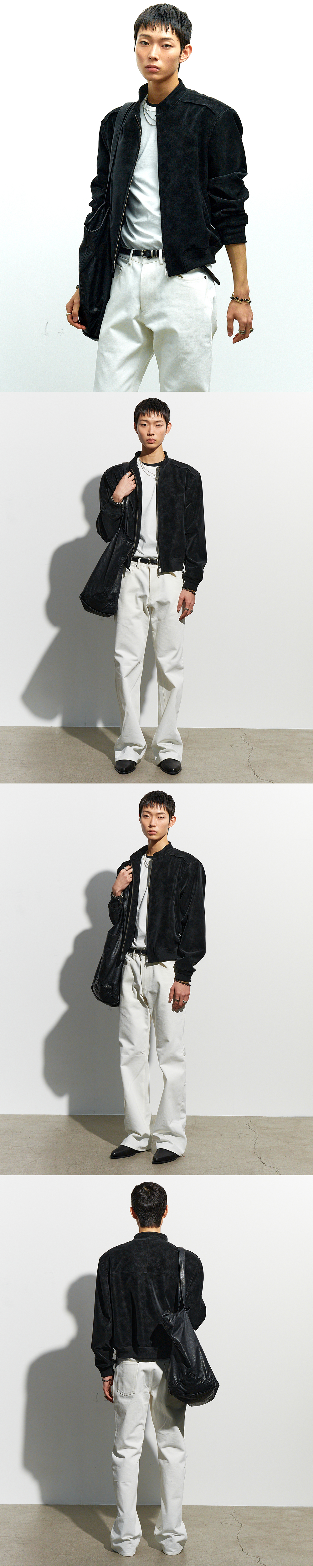 벨루어 텍스처의 원단으로 제작된 스탠드 칼라 블루종입니다. 부드러운 표면감과 은은한 광택이 어우러져 차분하면서도 세련된 인상을 형성합니다. 스탠드 칼라 구조와 어깨 패드, 견장 디테일이 상체 실루엣을 또렷하게 잡아주며 구조적인 균형을 완성합니다. -DETAIL- 스탠드 칼라 디자인 어깨 패드 내장 어깨 견장 디테일 프런트 지퍼 여밈 사이드 지퍼 포켓 밑단·소맷단 립 조직 마감 MADE IN KOREA