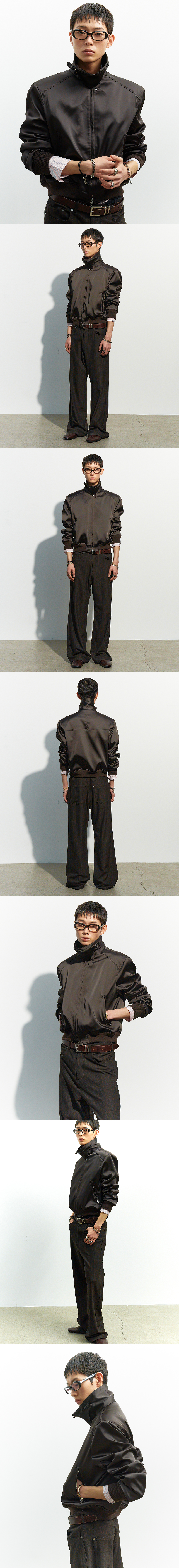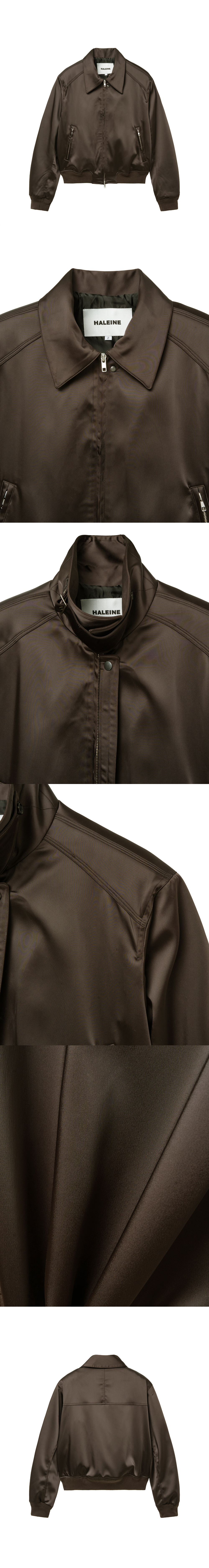 새틴 소재를 사용해 은은한 광택과 매끄러운 표면감을 갖춘 블루종입니다. 어깨 패드를 더한 구조적인 상부 실루엣이 형태를 안정적으로 유지하며, 컴팩트한 기장으로 균형 잡힌 비율을 완성합니다. 칼라 상단에 더해진 네크라인 벨트 디테일을 활용해 목선을 감싸는 하이넥 실루엣으로 연출할 수 있습니다. -DETAIL- 스트럭처드 실루엣 새틴 소재 사용 어깨 패드 내장 프런트 지퍼 여밈 지퍼 포켓 디테일 네크라인 벨트 디테일 (탈부착 가능하며 안감에 단추로 보관되어 있습니다.) MADE IN KOREA