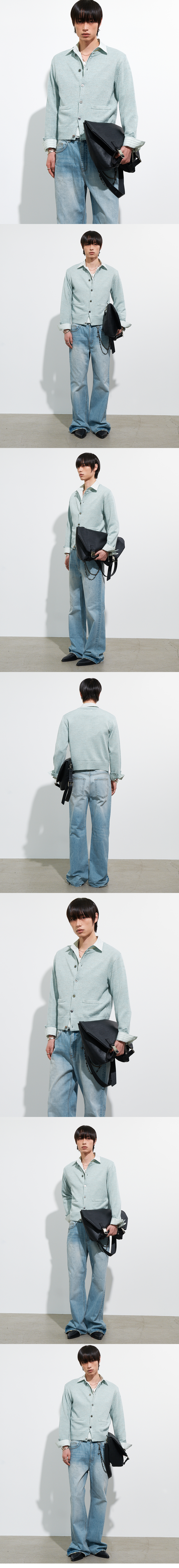 멜란지 텍스처의 울·리넨·코튼 혼방 원사로 제작된 라운드넥 가디건입니다. 래귤러한 바디 밸런스에 크롭한 기장을 더해 단정하면서도 경쾌한 실루엣을 형성합니다. 밀도감 있는 니트 조직이 형태를 안정적으로 유지하며, 소매단 버튼 디테일로 커프스처럼 연출할 수 있어 다양한 착용이 가능합니다. -DETAIL- 라운드넥 디자인 래귤러 & 크롭 실루엣 프런트 자개 버튼 여밈 소매단 자개 버튼 디테일 프론트 포켓 넥·밑단·소맷단 립 조직 마감 MADE IN KOREA