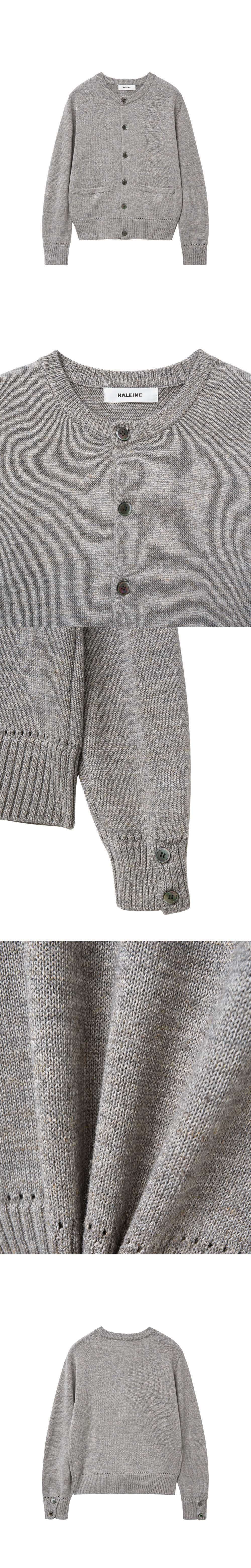 멜란지 텍스처의 울·리넨·코튼 혼방 원사로 제작된 라운드넥 가디건입니다. 래귤러한 바디 밸런스에 크롭한 기장을 더해 단정하면서도 경쾌한 실루엣을 형성합니다. 밀도감 있는 니트 조직이 형태를 안정적으로 유지하며, 소매단 버튼 디테일로 커프스처럼 연출할 수 있어 다양한 착용이 가능합니다. -DETAIL- 라운드넥 디자인 래귤러 & 크롭 실루엣 프런트 자개 버튼 여밈 소매단 자개 버튼 디테일 프론트 포켓 넥·밑단·소맷단 립 조직 마감 MADE IN KOREA
