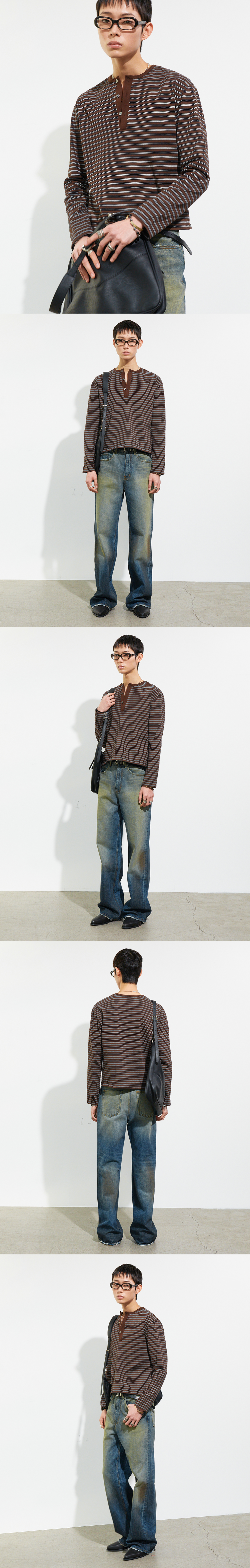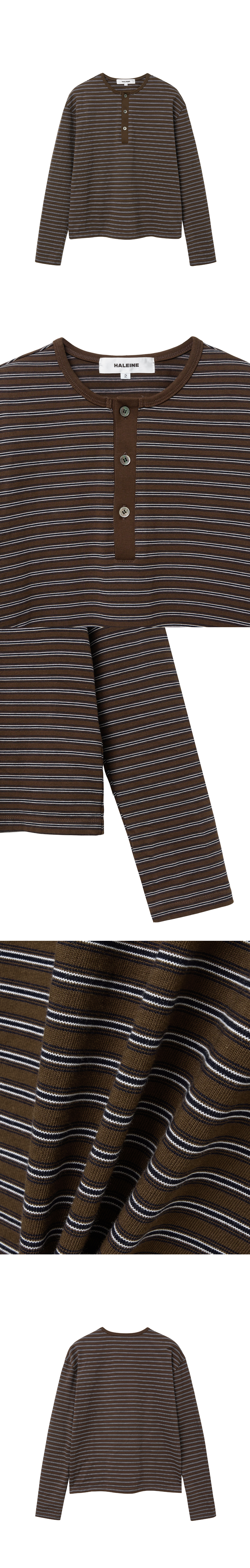 가볍고 부드러운 터치감의 스트라이프 원단으로 제작된 헨리넥 티셔츠입니다. 크롭한 기장으로 트렌디한 실루엣을 완성했으며, 심플한 스트라이프 패턴이 전체적인 디자인의 중심을 완성합니다. 심플한 디자인 속에서 패턴과 디테일이 돋보이는 아이템입니다. -DETAIL- 스트라이프 원단 헨리넥 디자인 크롭 기장 천연 자개 단추 MADE IN KOREA