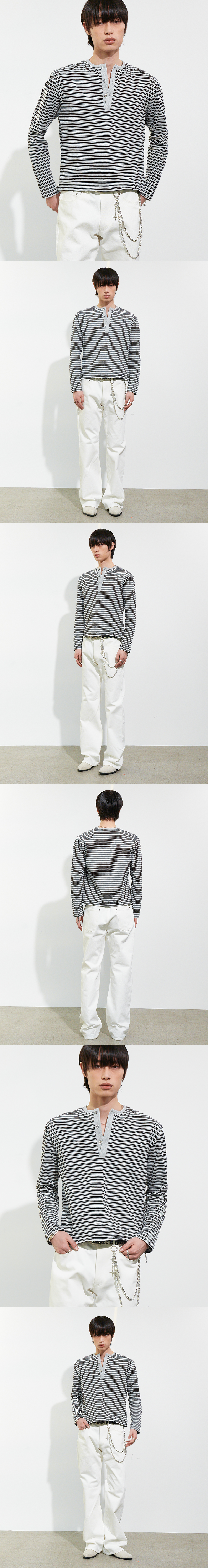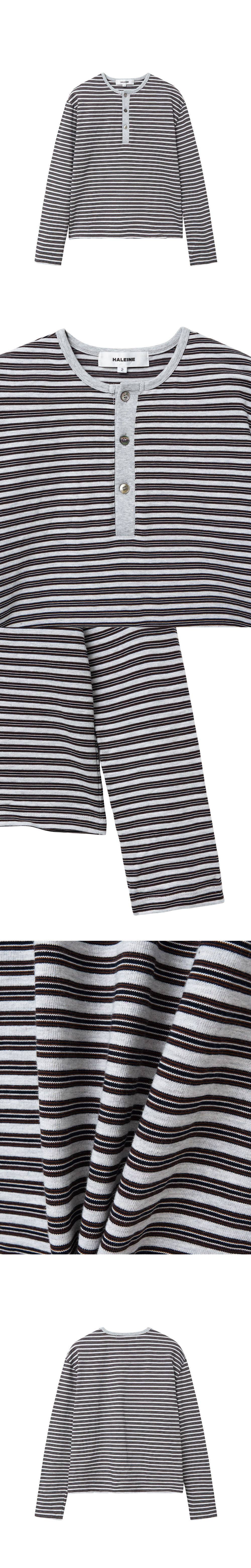 가볍고 부드러운 터치감의 스트라이프 원단으로 제작된 헨리넥 티셔츠입니다. 크롭한 기장으로 트렌디한 실루엣을 완성했으며, 심플한 스트라이프 패턴이 전체적인 디자인의 중심을 완성합니다. 심플한 디자인 속에서 패턴과 디테일이 돋보이는 아이템입니다. -DETAIL- 스트라이프 원단 헨리넥 디자인 크롭 기장 천연 자개 단추 MADE IN KOREA