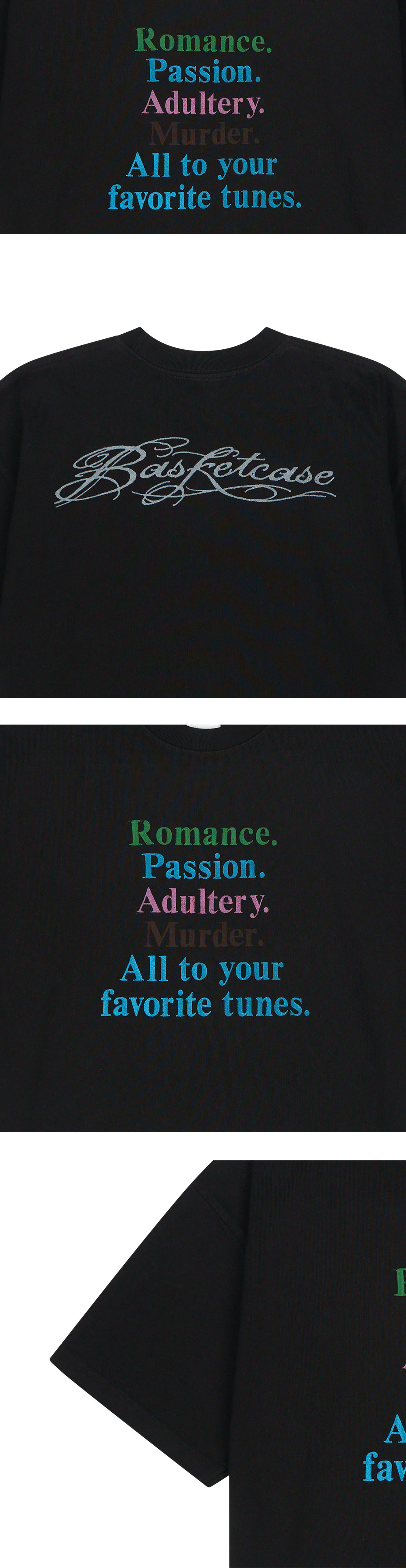 바스켓케이스 로맨스 티셔츠 제트 블랙 입니다. - 전면과 후면의 볼드한 그래픽 프린트가 돋보이는 디자인 - 탄탄한 마감의 골지 크루넥과 반소매 실루엣 - 스트릿하고 빈티지한 감성이 강조된 제트 블랙 컬러