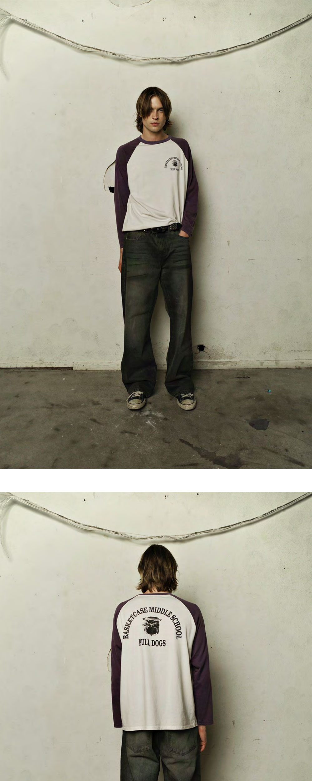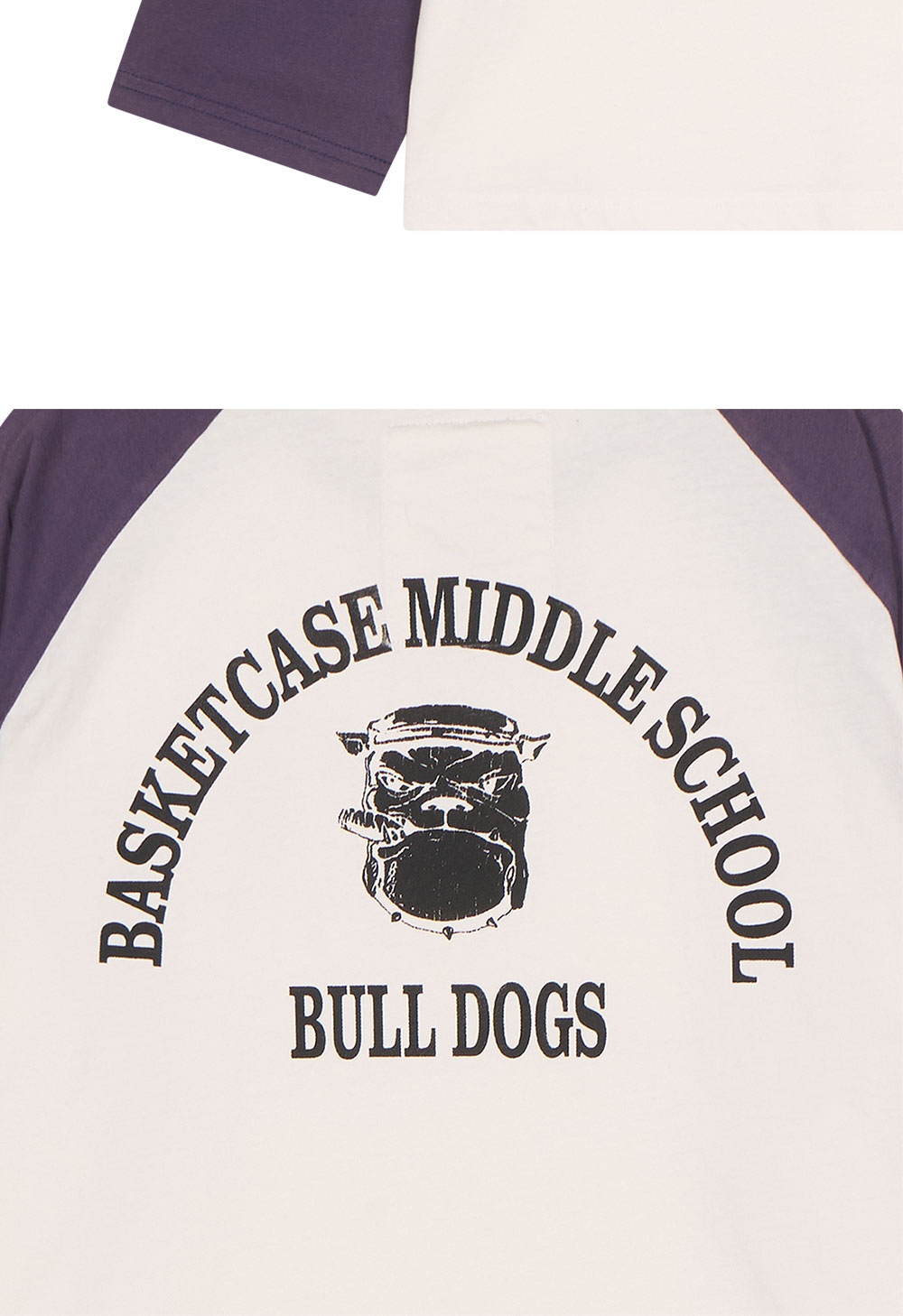 바스켓케이스 불독 래글런 화이트 퍼플 입니다. - 전면 가슴 부분의 '불독' 그래픽 프린트 포인트 - 화이트 바디와 퍼플 소매가 대비되는 래글런 디자인 - 형태 변형에 강한 탄탄한 립 크루넥 마감