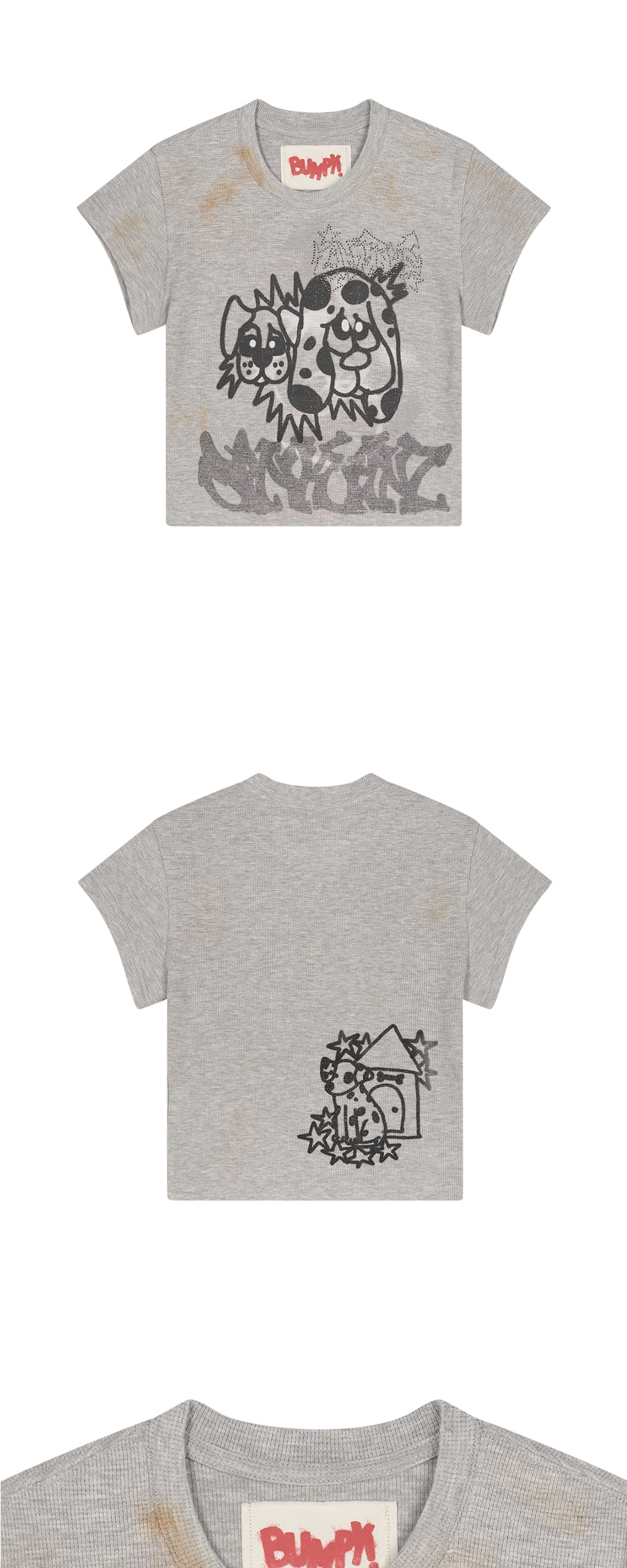 산쿠안즈 우먼 B26SSFTS0101 그래픽 숏 슬리브 그레이입니다. - 전면 캐릭터 드로잉과 후면 그래픽 프린트 - 빈티지한 오염 효과가 더해진 멜란지 그레이 컬러 - 짧은 기장과 캡 소매 형태의 크롭 실루엣 - 신축성 있는 립 조직 코튼 소재 사용