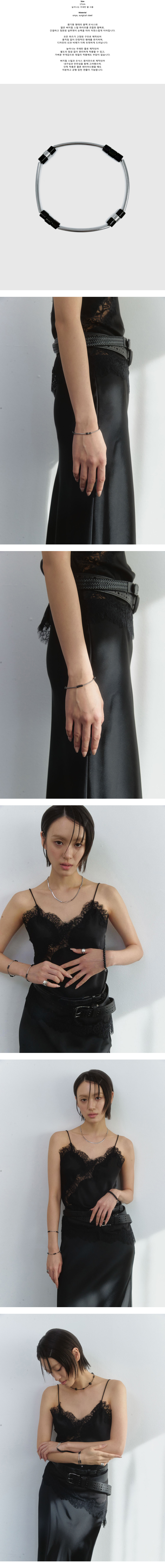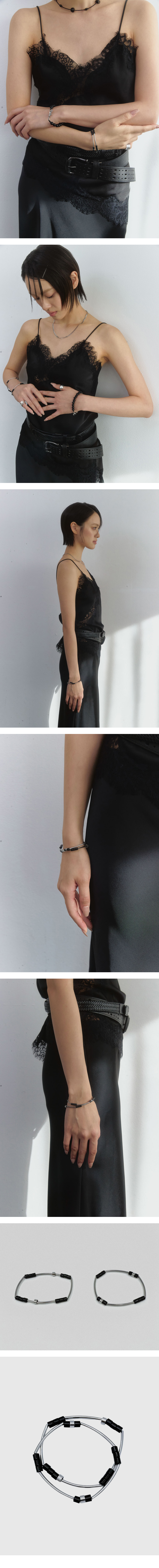 Size 17cm 늘어나는 우레탄 줄 사용 Material onyx, surgical steel 원기둥 형태의 블랙 오닉스와 얇은 써지컬 스틸 파이프를 조합한 팔찌로, 간결하고 정돈된 실루엣이 손목을 따라 자연스럽게 이어집니다. 모든 파츠가 고정된 구조로 제작되어 움직임 없이 안정적인 형태를 유지하며, 디자인의 선과 비례가 더욱 또렷하게 드러납니다. 늘어나는 우레탄 줄로 제작되어 별도의 잠금 없이 편리하게 착용할 수 있고, 가벼운 무게감으로 데일리 착용에도 부담이 없습니다. 써지컬 스틸과 오닉스 원석만으로 제작되어 내구성과 안전성을 함께 고려했으며, 단독 착용은 물론 레이어드했을 때도 차분하고 균형 잡힌 연출이 가능합니다.