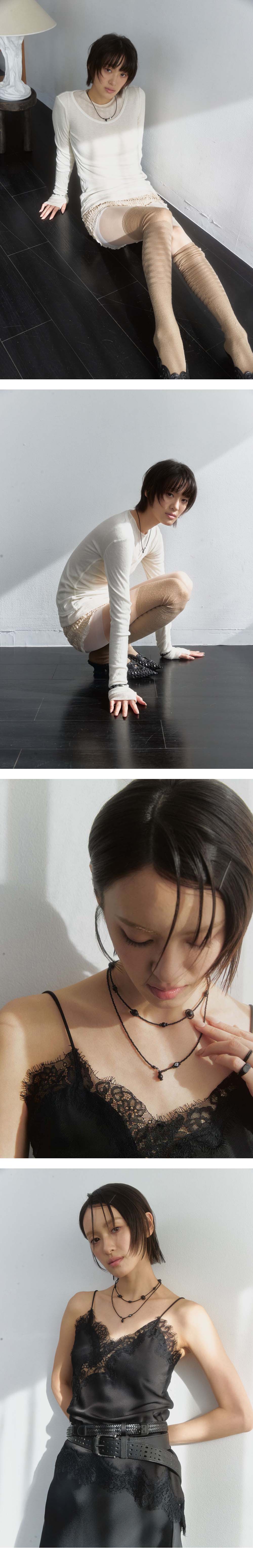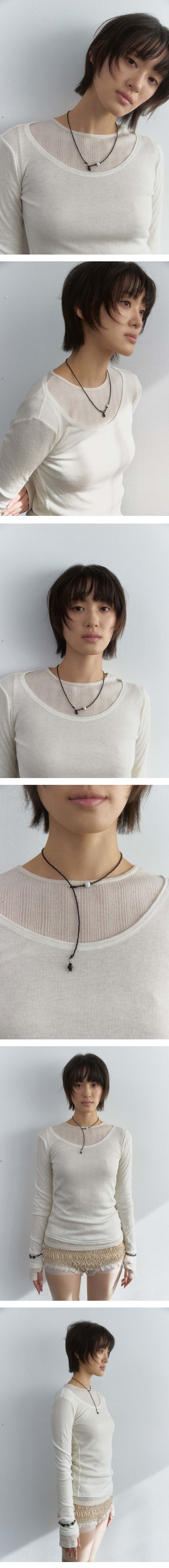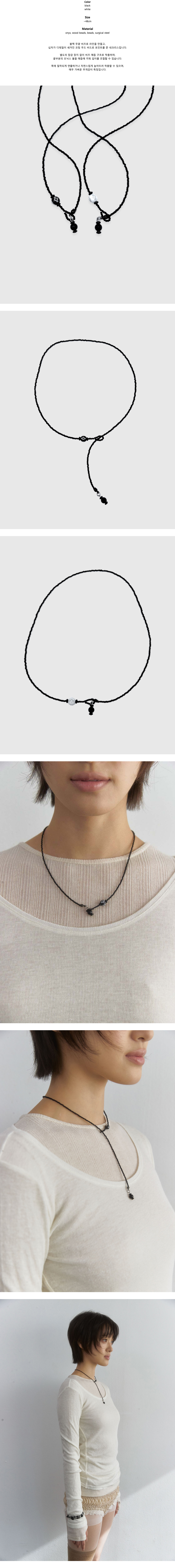 Color black white Size ~48cm Material onyx, wood beads, beads, surgical steel 블랙 무광 비즈로 라인을 만들고, 십자가 디테일이 새겨진 코팅 우드 비드로 포인트를 준 네크리스입니다. 별도의 잠금 장치 없이 비즈 매듭 구조로 착용하며, 끝부분의 오닉스 볼을 매듭에 끼워 길이를 조절할 수 있습니다. 목에 밀착되게 연출하거나 자연스럽게 늘어뜨려 착용할 수 있으며, 매우 가벼운 무게감이 특징입니다.