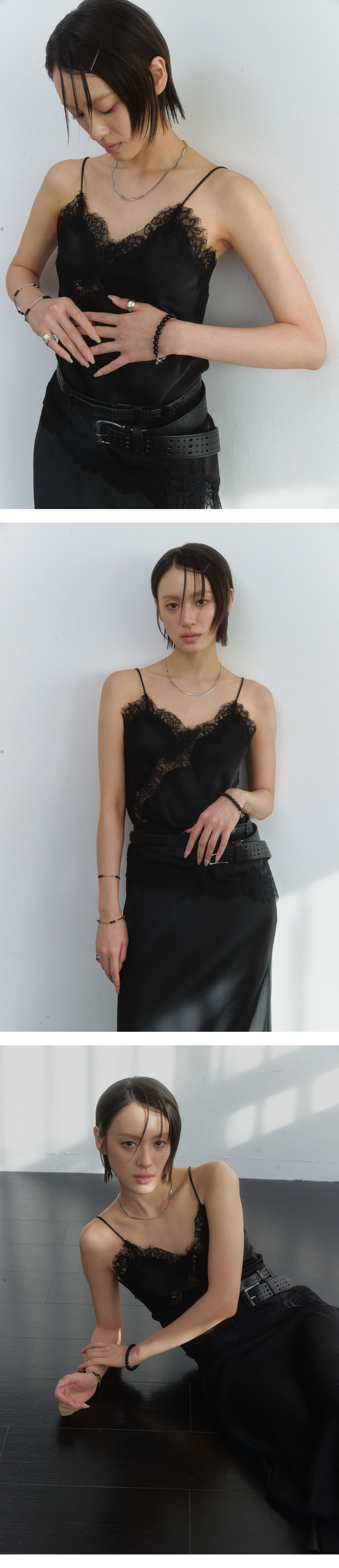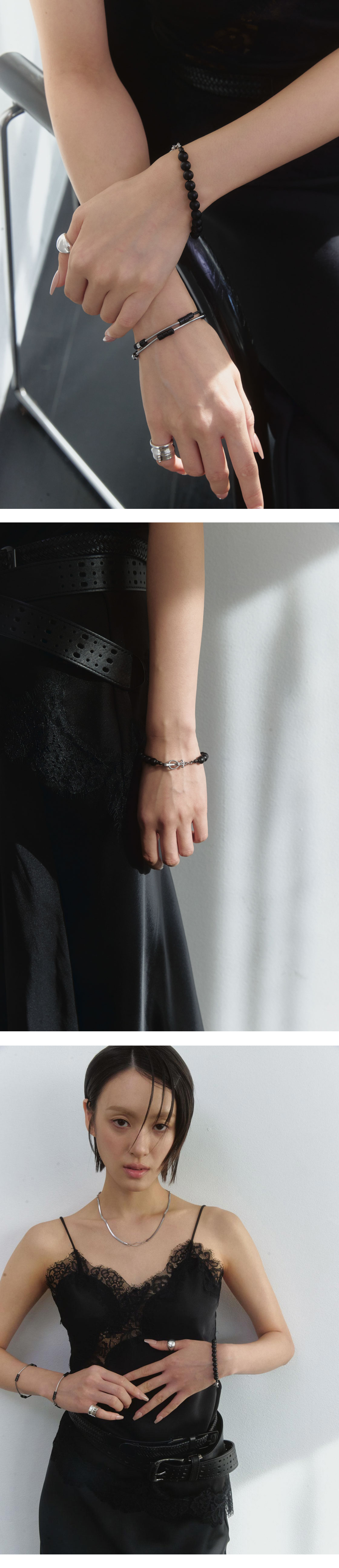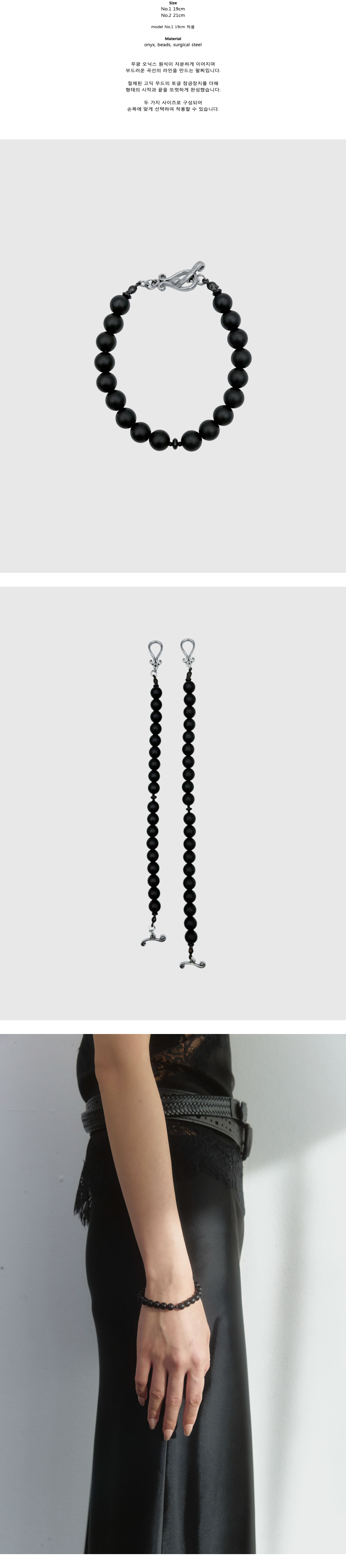 Size No.1 19cm No.2 21cm model No.1 19cm 착용 Material onyx, beads, surgical steel 무광 오닉스 원석이 차분하게 이어지며 부드러운 곡선의 라인을 만드는 팔찌입니다. 절제된 고딕 무드의 토글 잠금장치를 더해 형태의 시작과 끝을 또렷하게 완성했습니다. 두 가지 사이즈로 구성되어 손목에 맞게 선택하여 착용할 수 있습니다.