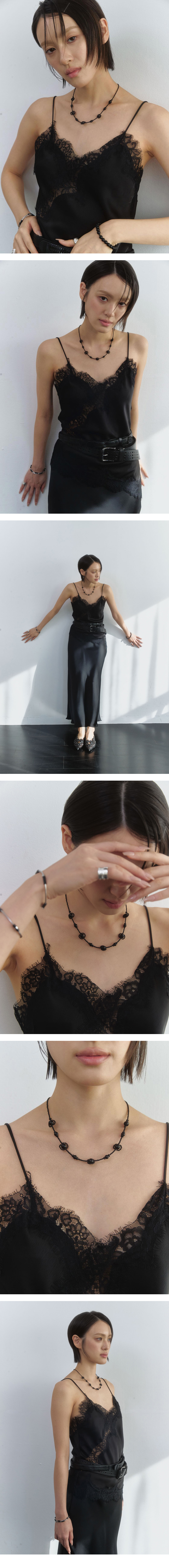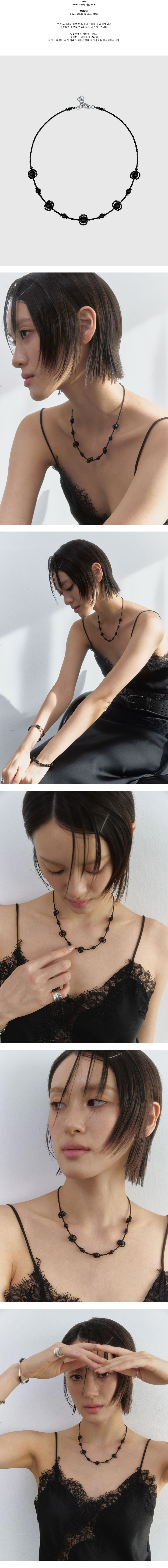 Size 45cm +조절체인 3cm Material onyx, beads, surgical steel 무광 오닉스와 블랙 비즈가 포인트를 두고 배열되어 구조적인 흐름을 만들어내는 네크리스입니다. 앞부분에는 패턴을 더하고, 뒷부분은 비즈로 마무리해 비즈의 짜임과 쉐입 자체가 자연스럽게 드러나도록 구성되었습니다.