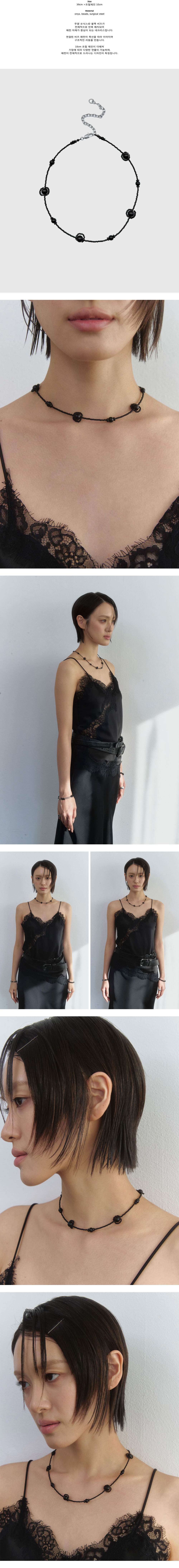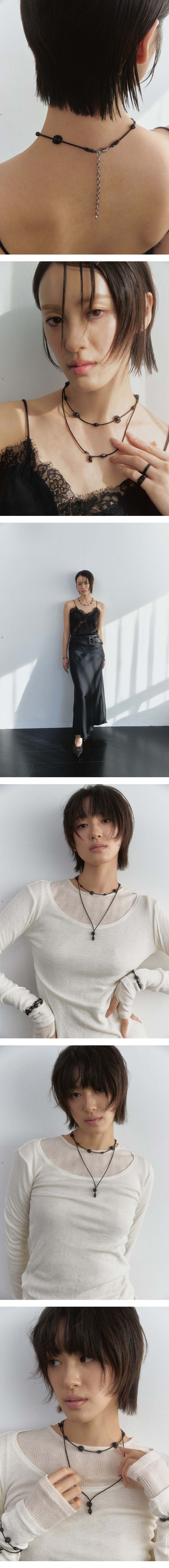 Size 39cm +조절체인 10cm Material onyx, beads, surgical steel 무광 오닉스와 블랙 비즈가 전체적으로 반복 배치되어 패턴 자체가 중심이 되는 네크리스입니다. 연결된 비즈 패턴이 목선을 따라 이어지며 구조적인 리듬을 만듭니다. 10cm 조절 체인이 더해져 기장에 따라 다양한 연출이 가능하며, 패턴이 전체적으로 드러나는 디자인이 특징입니다.
