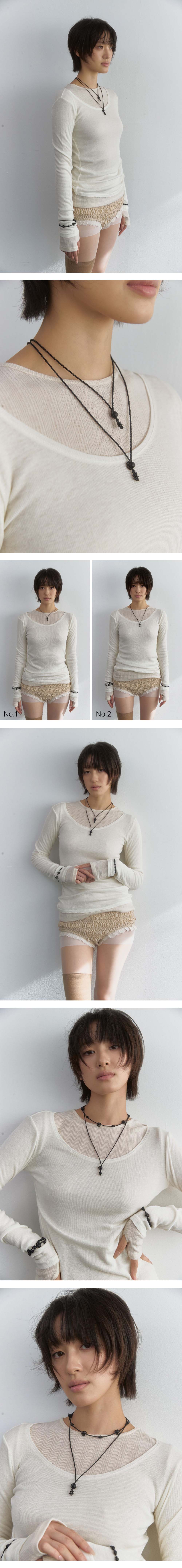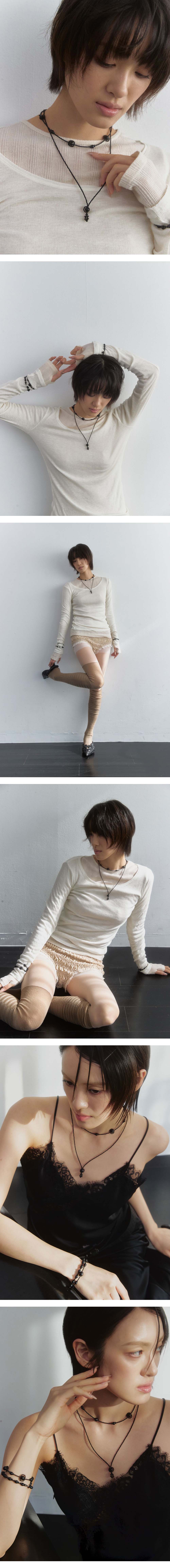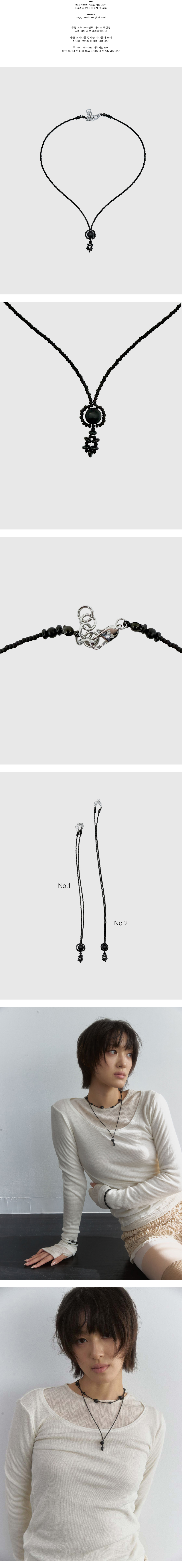 Size No.1 43cm +조절체인 2cm No.2 53cm +조절체인 2cm Material onyx, beads, surgical steel 무광 오닉스와 블랙 비즈로 구성된 드롭 형태의 네크리스입니다. 둥근 오닉스를 감싸는 비즈들이 모여 하나의 펜던트 형태를 이룹니다. 두 가지 사이즈로 제작되었으며, 잠금 장치에는 산리 로고 디테일이 적용되었습니다.