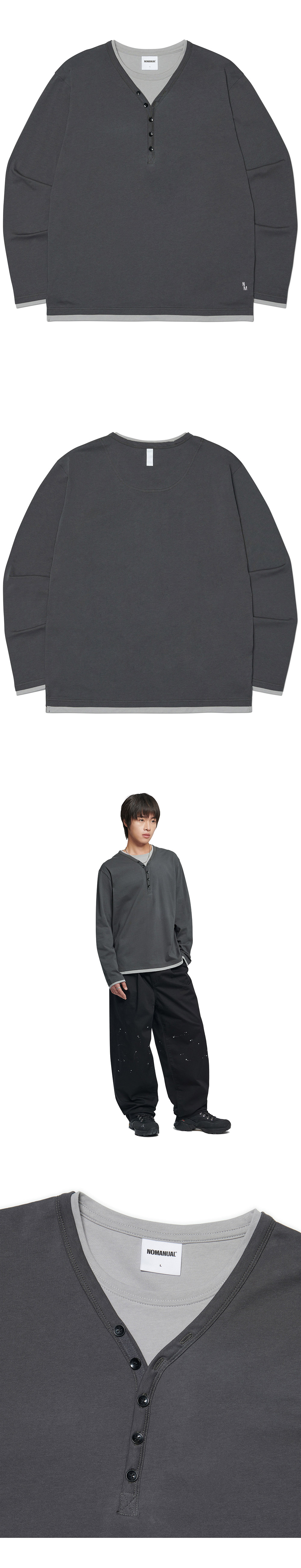 노매뉴얼 레이어드 헨리 넥 롱 슬리브 티 차콜