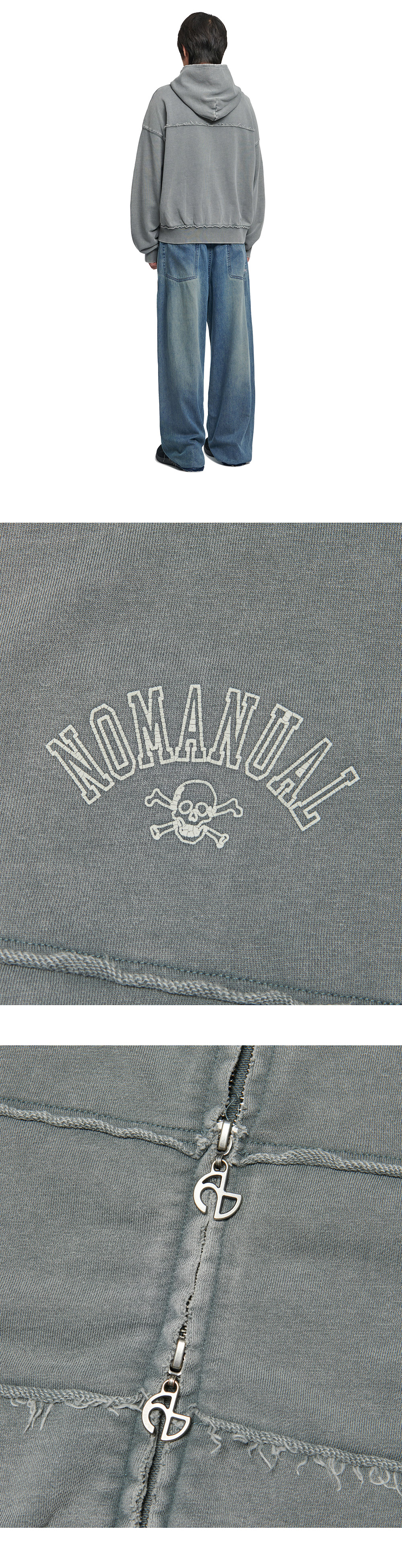 NOMANUAL Raw Edge Hooded Zip-Up Washed Gray
