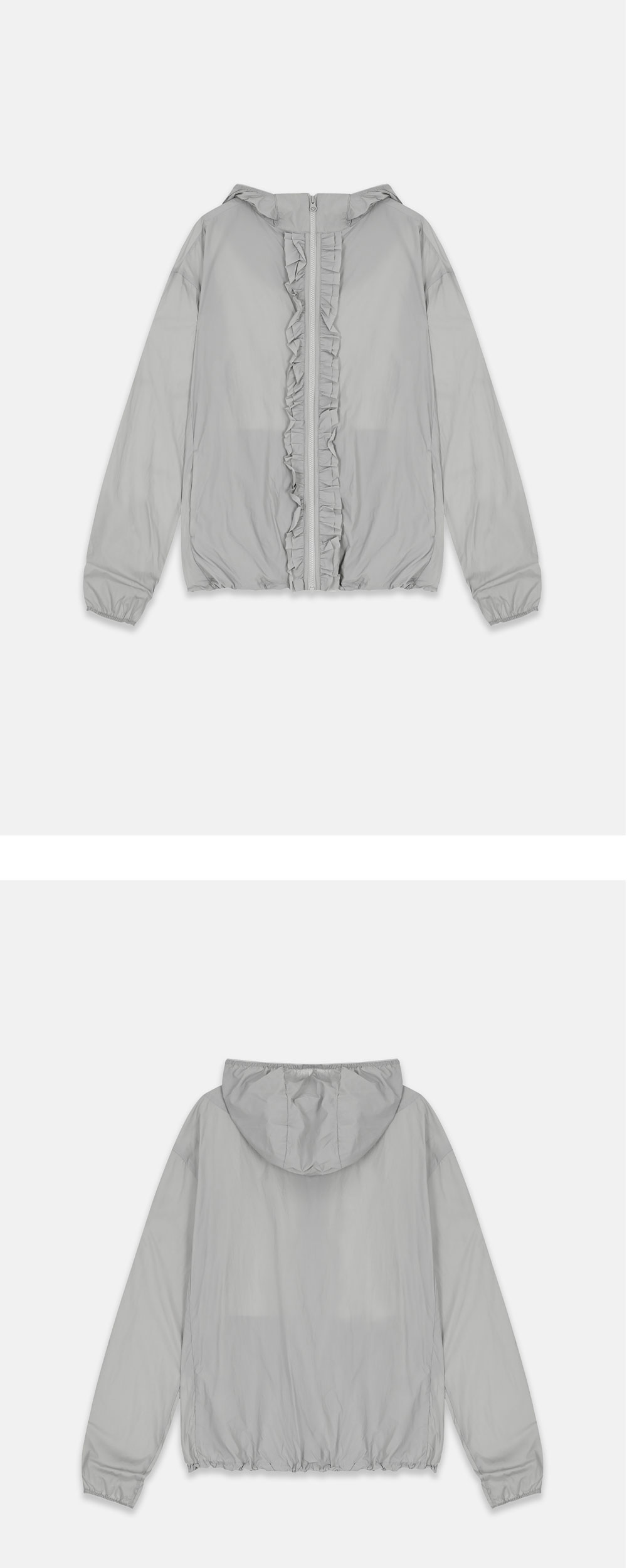 나체 우먼 러플 윈드 브레이커 라이트 그레이 입니다. - 가볍고 매끄러운 질감의 나일론 혼방 소재 - 전면 지퍼 라인의 입체적인 러플 디테일 - 소매단 밴딩 처리로 안정적인 착용감 제공