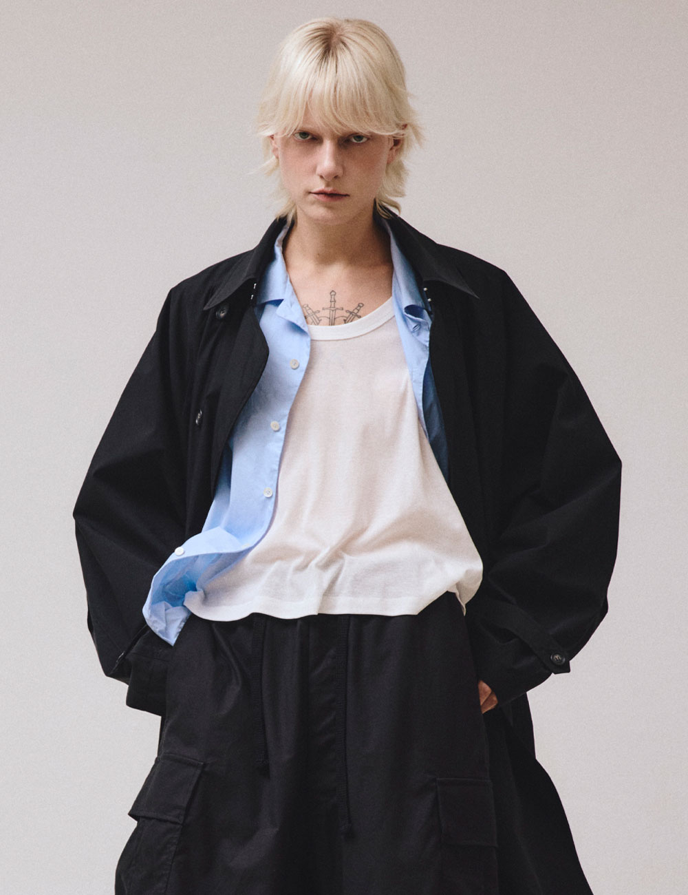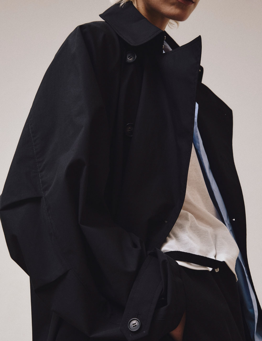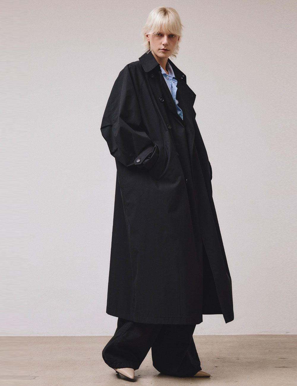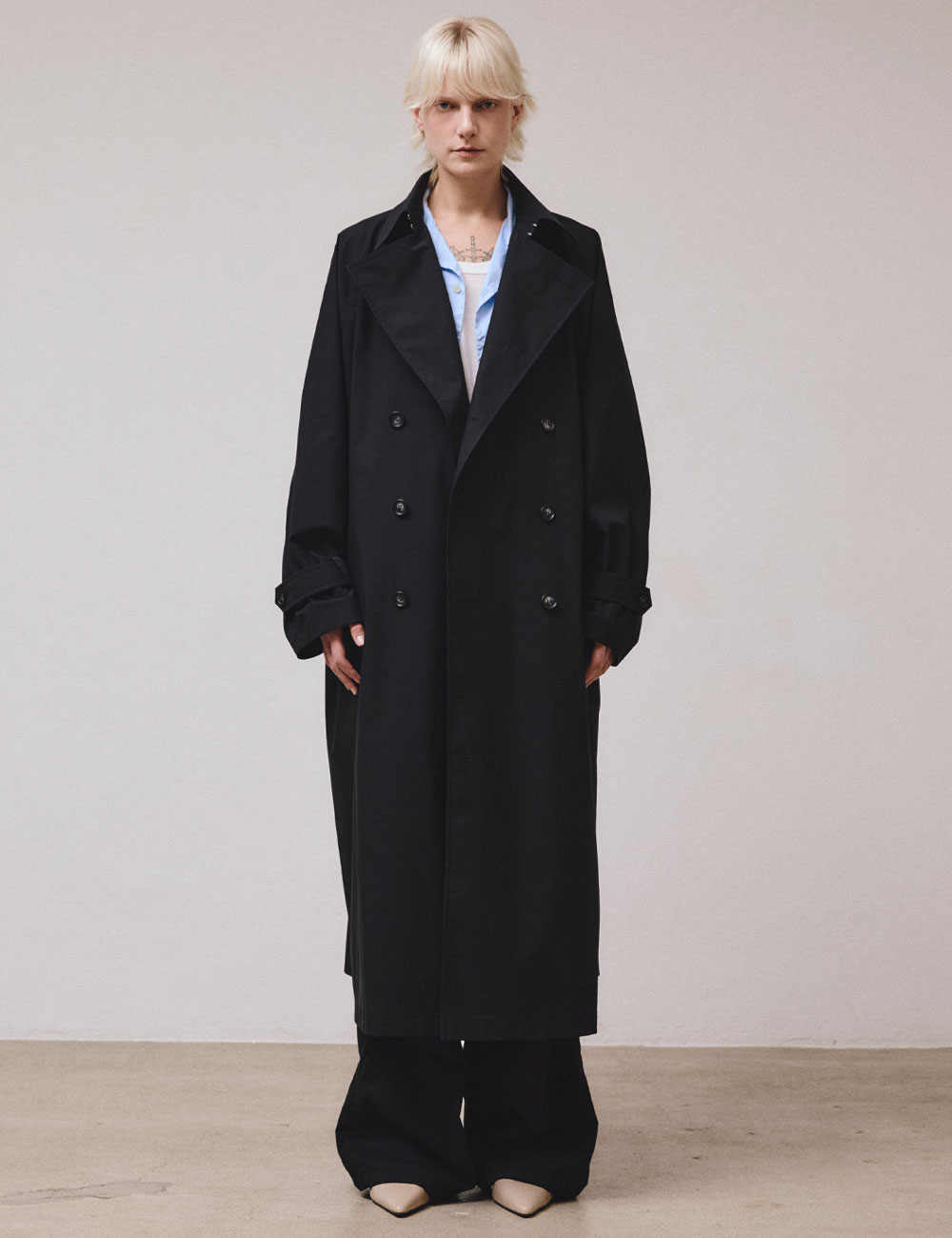 - 오버한 핏의 트렌치 코트 - 오가닉 면혼방의 발수기능이 있는 해외 수입 원단 - 형태 회복성이 뛰어난 솔로텍스 원단 - 스트레치성이 있어 편안한 착용감 - 스프레드 칼라와 더블 버튼 여밈 - 넥 후크여밈과 조절 가능한 소매 버튼 탭