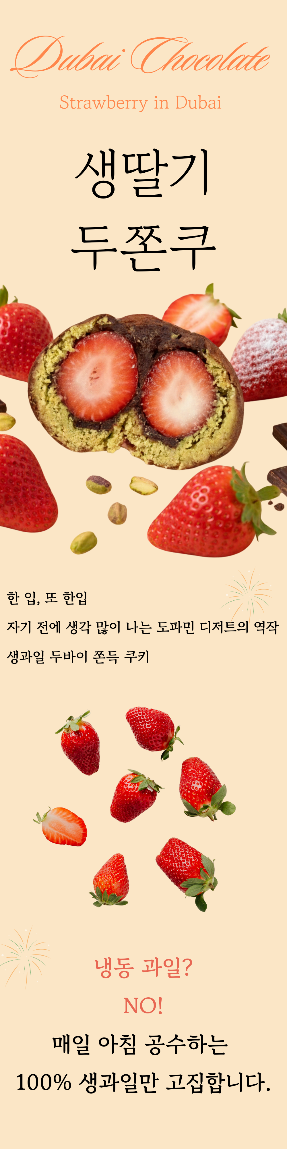 제철 생딸기와 키위를 두바이쫀득쿠키에 넣었습니다. 한입 먹으면 과즙과 함께 바삭하게 씹히는 피스타치오 카다이프를 꼭 경험해보세요. 한입 먹으면 또 먹고 싶어지는 도파민 디저트의 생과일 두쫀쿠, 이제는 선물세트로 만나보세요 :) *구성 : 생딸기 1구 + 키위 1구 + 오리지널 2구 두바이쫀득쿠키 총 4구 세트 * 1차 출고 : 2/25 ~2/27 오후 1시 이전 주문건 -> 익일배송 * 2차 출고 : 2/27 오후 1시 이후 주문 건 -> 3/6 부터 신선택배 순차출고 되어집니다 :)