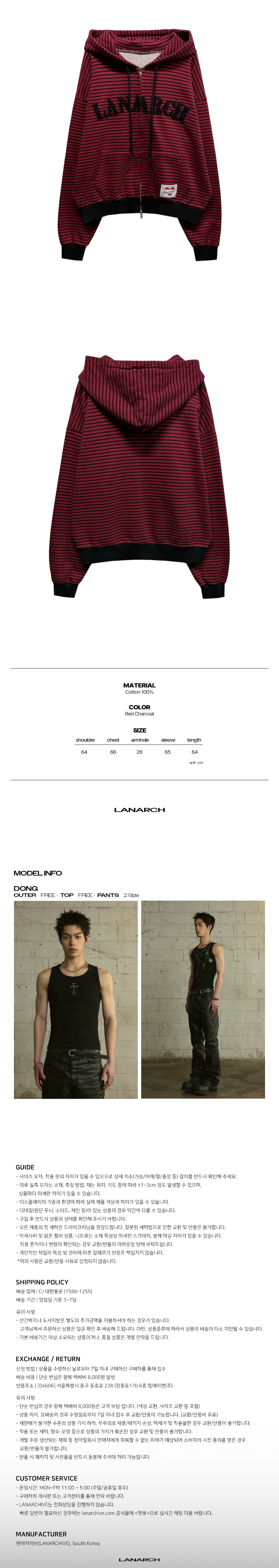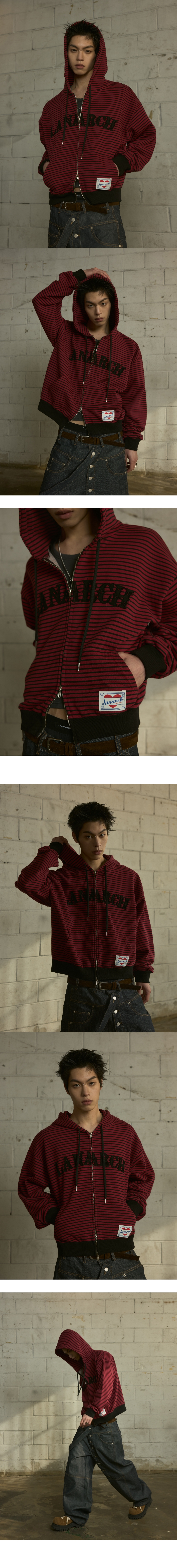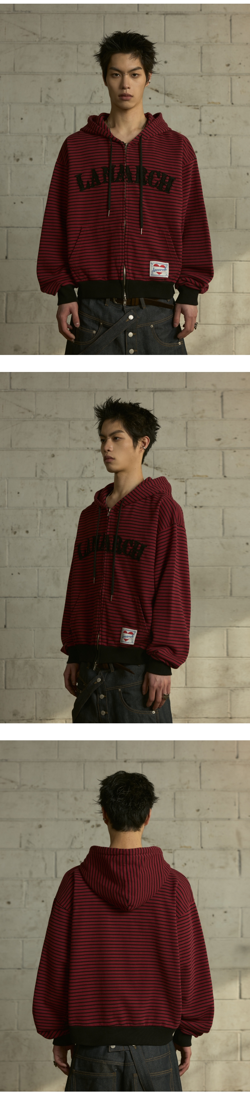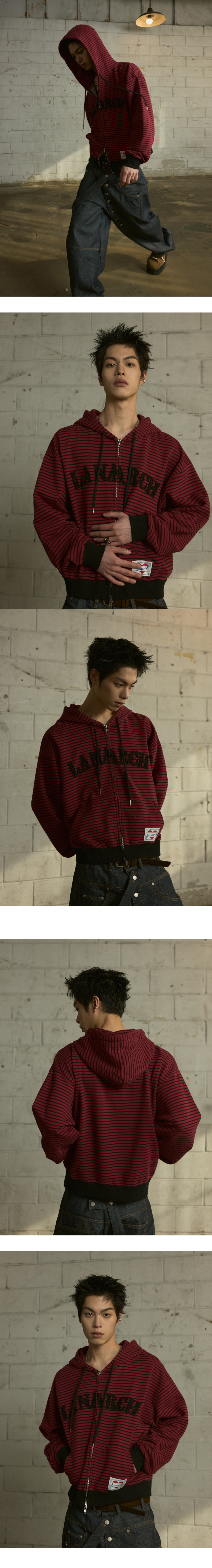 랜 아카이브 0116 로고 아플리케 스트라이프 집업 후디 - 레드